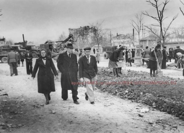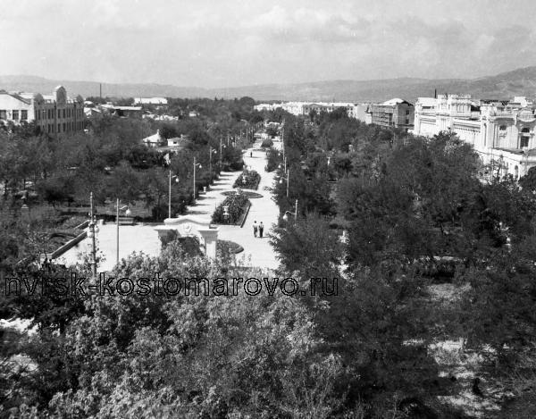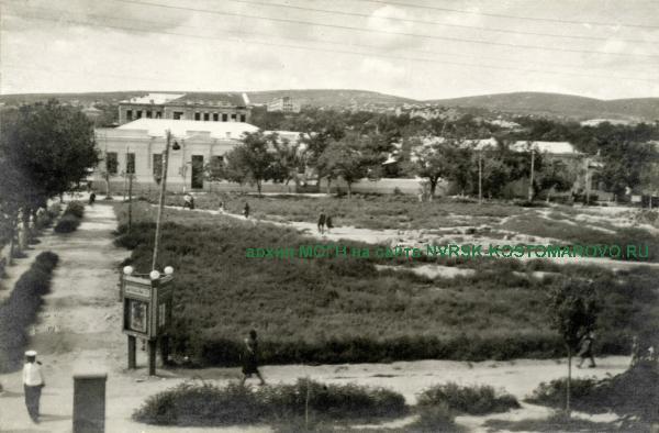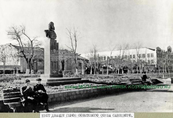 Слева-бюст Дважды Героя Савицкого.Трехэтажное здание дальше- швейная фабрика имени Кирова. Над ним видно здание первой поликлиники.  Справа-чудом уцелевший старый дом в дваа этажа.