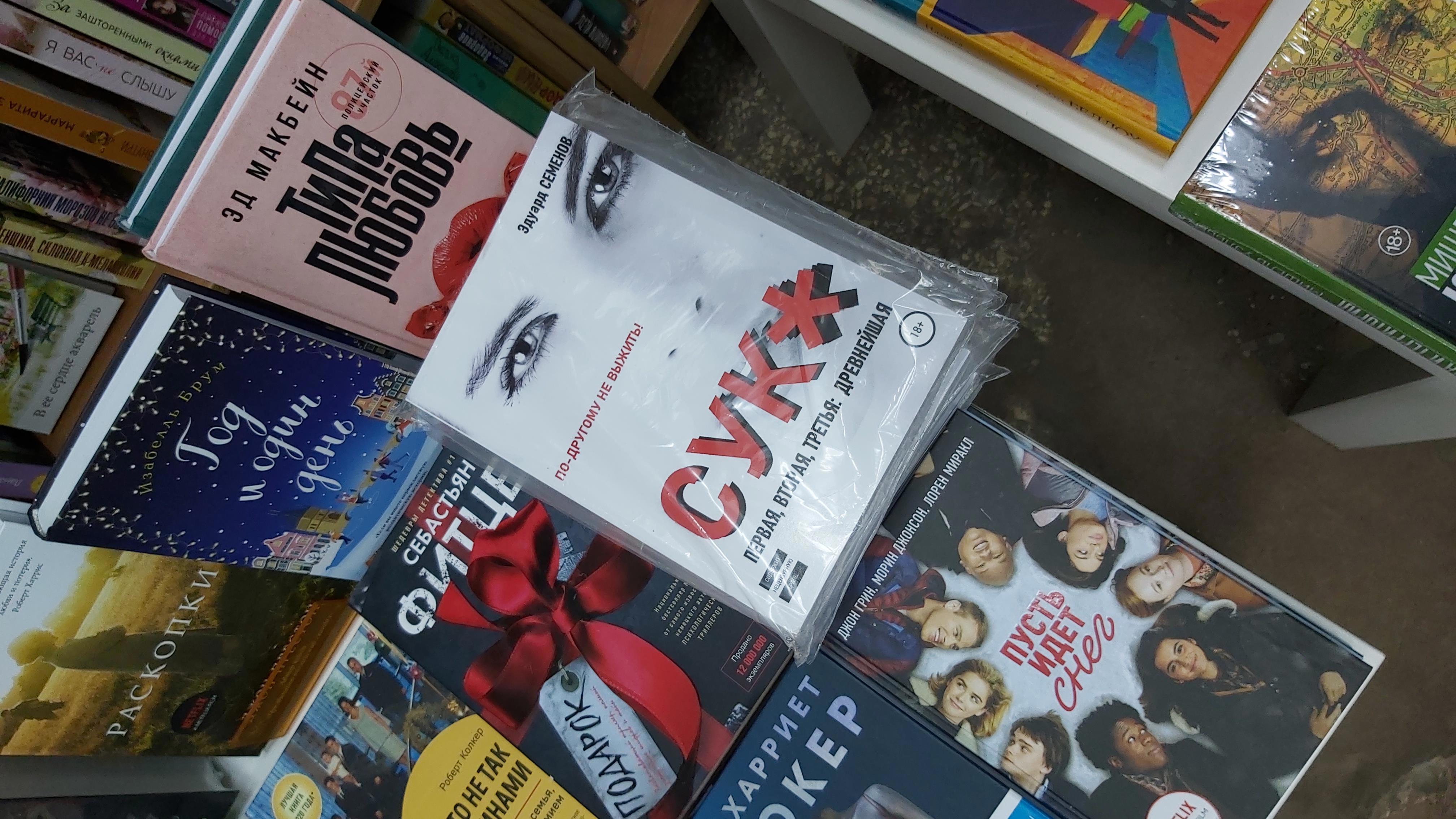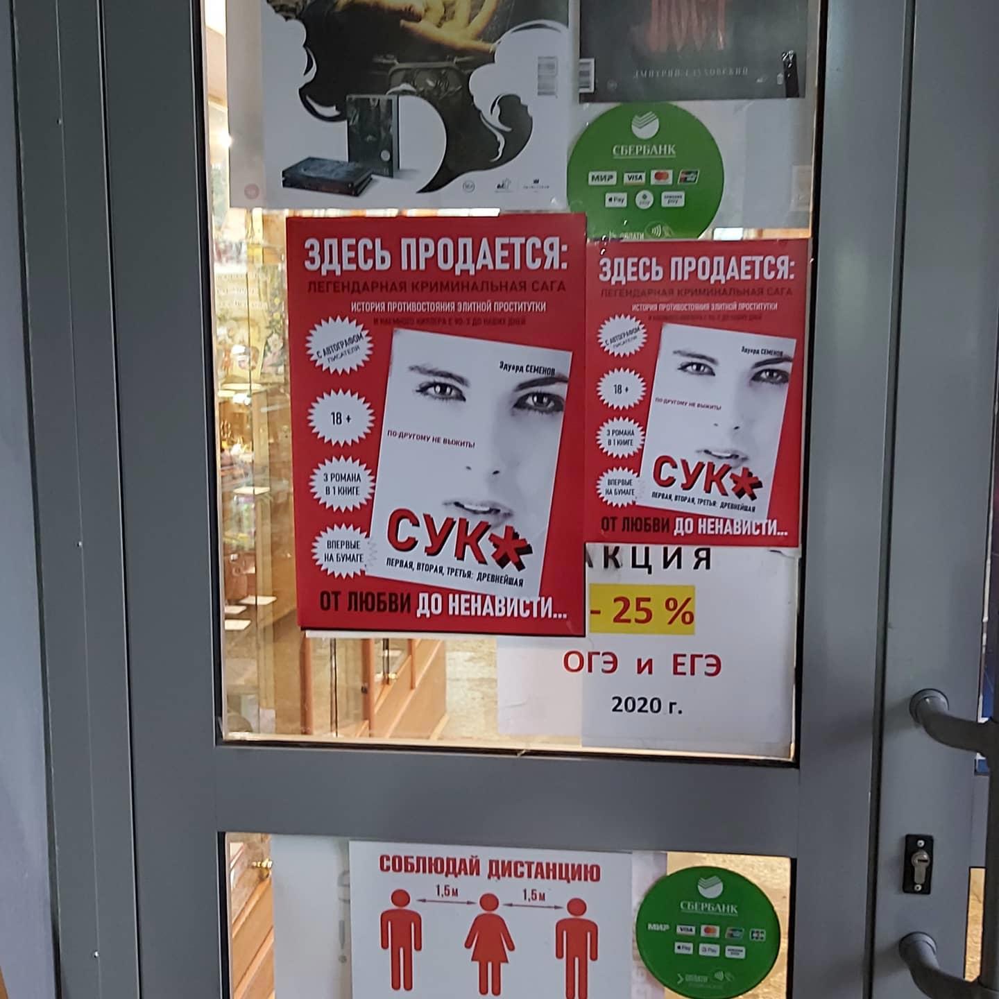 Тоже самое и с книгами. Чтобы знать, где продается легендарная криминальная сага "Сук*:по-другому не выжить!" и понять как же она выглядит на книжной полке в книжном магазине выкладываю фото плаката на дверях магазина и собственно самого магазина.