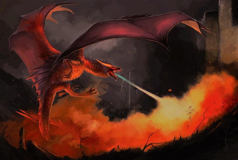 Наиболее алчные из истинных драконов, красные драконы безустанно ищут способ пополнить свои сокровищ. Они исключительно тщеславны, даже по драконьим меркам. Их самомнение отражается в надменном обращении и презрении к другим существам. Запах серы и пемзы окутывает красного дракона, которого легко узнать по изогнутым назад рогам и перепончатому гребню вдоль хребта. Из его ноздрей на похожей на клюв морде постоянно исходит дым, а в глазах вспыхивают огоньки, когда он злится. Размах крыльев красных драконов больше, чем у любого другого вида цветных драконов, а цвет их переходит от красного к иссиня-чёрному цвету пережжённого металла у края крыльев. Чешуя вирмлинга красного дракона блестящая и ярко-алая, но темнеет и тускнеет с возрастом, становясь всё толще и крепче. Также их зрачки с возрастом исчезают, и глаза старейших красных драконов становятся похожи на колодцы расплавленной лавы.