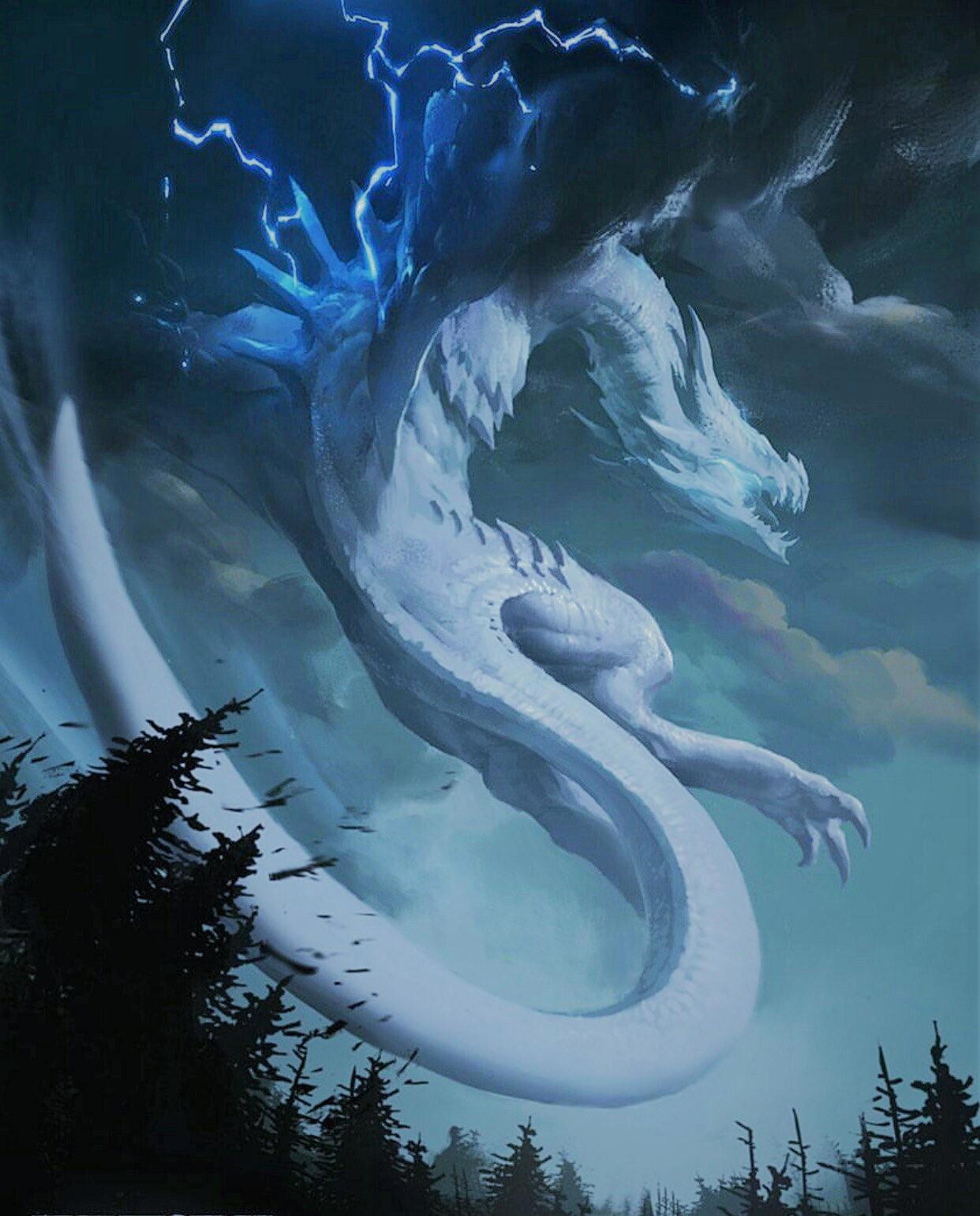 Меньшие, менее разумные и наиболее звероподобные из цветных драконов, белые драконы обитают в холодных условиях, предпочитая снежные области и ледяные горы. Эти драконы злобны, жестоки и ведомы голодом и жадностью. Белые драконы отличаются диким взглядом, обтекаемой формой тела и острым хохолком. Чешуя вирмлингов белых драконов сверкает идеальной белизной. С возрастом их блеск исчезает, и некоторые из чешуек темнеют, к старости создавая бледно-голубые и светло-серые пятна. Такая расцветка помогает драконам во время охоты спрятаться среди льдов и камней или затеряться на фоне затянутого тучами неба.