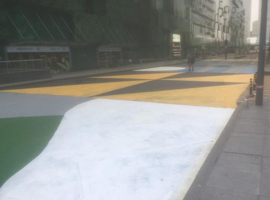 Тем временем в Москва-сити тоже озаботились нововведениями. Теперь оно пешеходное, ездить по нему нельзя. Вот там, где теперь разноцветные фрески на асфальте - ездить нельзя. А раньше это была центральная автомобильная улица субурбии - тут главный вход в Афимолл, в который все и стремятся.