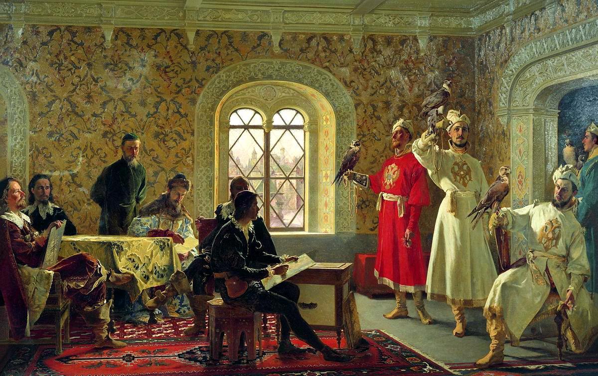 А. Литовченко. Итальянский посланник Кальвуччи зарисовывает любимых соколов царя Алексея Михайловича. 1889