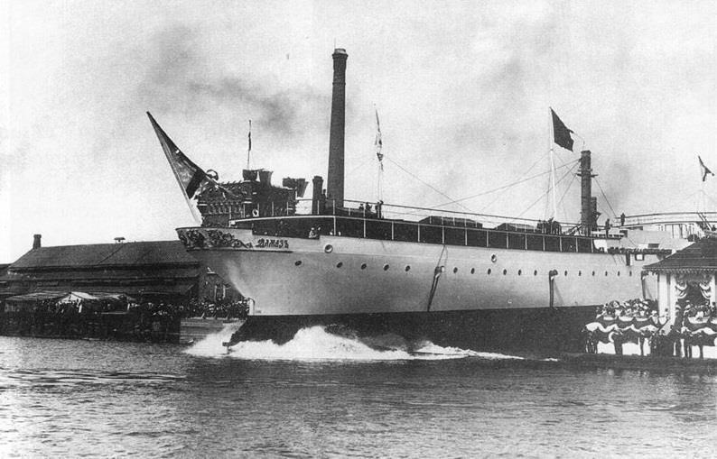 Бывшее двухвинтовое стальное посыльное судно - яхта с парусным вооружением «АЛМАЗ». 21.04.1901 г. приказом по Мор.Веду включен в списки с этим именем. 12.09. 1902 г. офиц. закладка с участием имп. Николая II и греч. королевы Ольги Константиновны, и в этот день приказом № 430 по Мор.Веду стал числиться кр.2 ранга и вошел в 8 ФЭ. Строитель А.И. Моисеев. В 10.00. 20.05.1903 г. спуск. 08.1903 г. еще в достройке принял участие в спусках эс.бр. «СЛАВА», кр. «ОЛЕГ» и яхты «АЛЕКСАНДРИЯ». 08.10. ушел в море на заводские испытания. В 15.30. 25.10. с тр. «ХАБАРОВСК» вышли из Кронштадта в Ревель – пришли 26.10. Ночью 12.11. шторм прижал к стенке гавани - помят левый винт и отломлена ниж. часть пера руля. 20.11. ходовые испытания. По окончании работ, 05.12. прошѐл испытания в бух. Ревеля, и был взят в казну. Цена 2.808.500 руб. 07-09.12. поход Ревель - о.Борнхольм - Либава. В 22.00. 16.12. ушел в Киль. Прибыл вечером 18.12., и утром 21.12. вошел в Кильский канал. На выходе вечером того дня зацепил бровку канала (без повреждений) и ушел в Немецкое море. 24.12. прибыл в Брест и, взяв уголь, в 12.00. 27.12. ушел в Бискайский зал. - на переходе прошѐл шторм с креном до 35°. Свернув в Ферроль 28.12., встретился с шедшими на Балтику эс.бр. «ИМПЕРАТОР НИКОЛАЙ I» и м.кр.«АБРЕК». Придя днем 29.12.1903 г. в Эль – Ферроль, 01.01.1904 г. ушел в Алжир, прибыв туда 05.01., и 16.01. стал в док. .