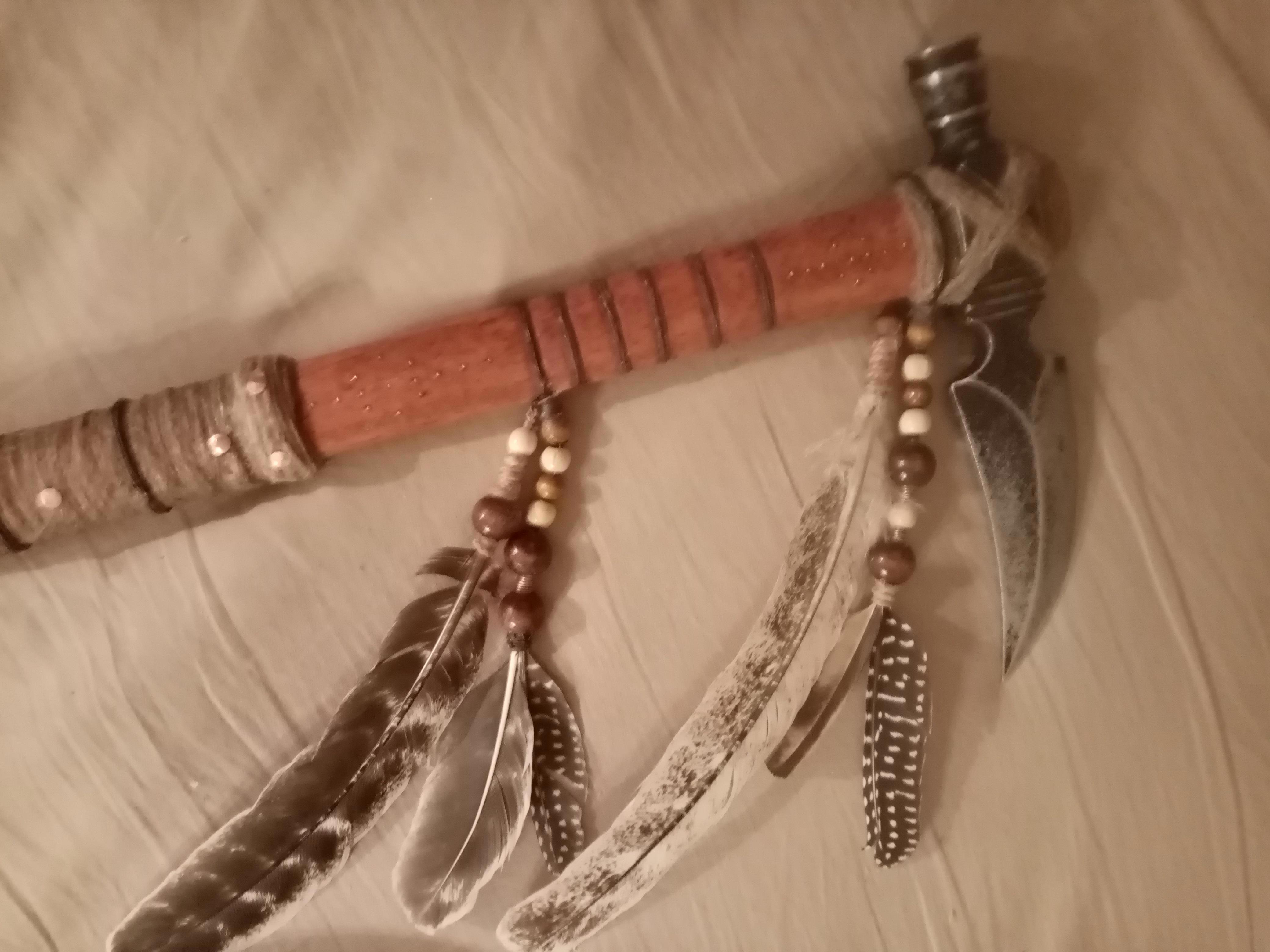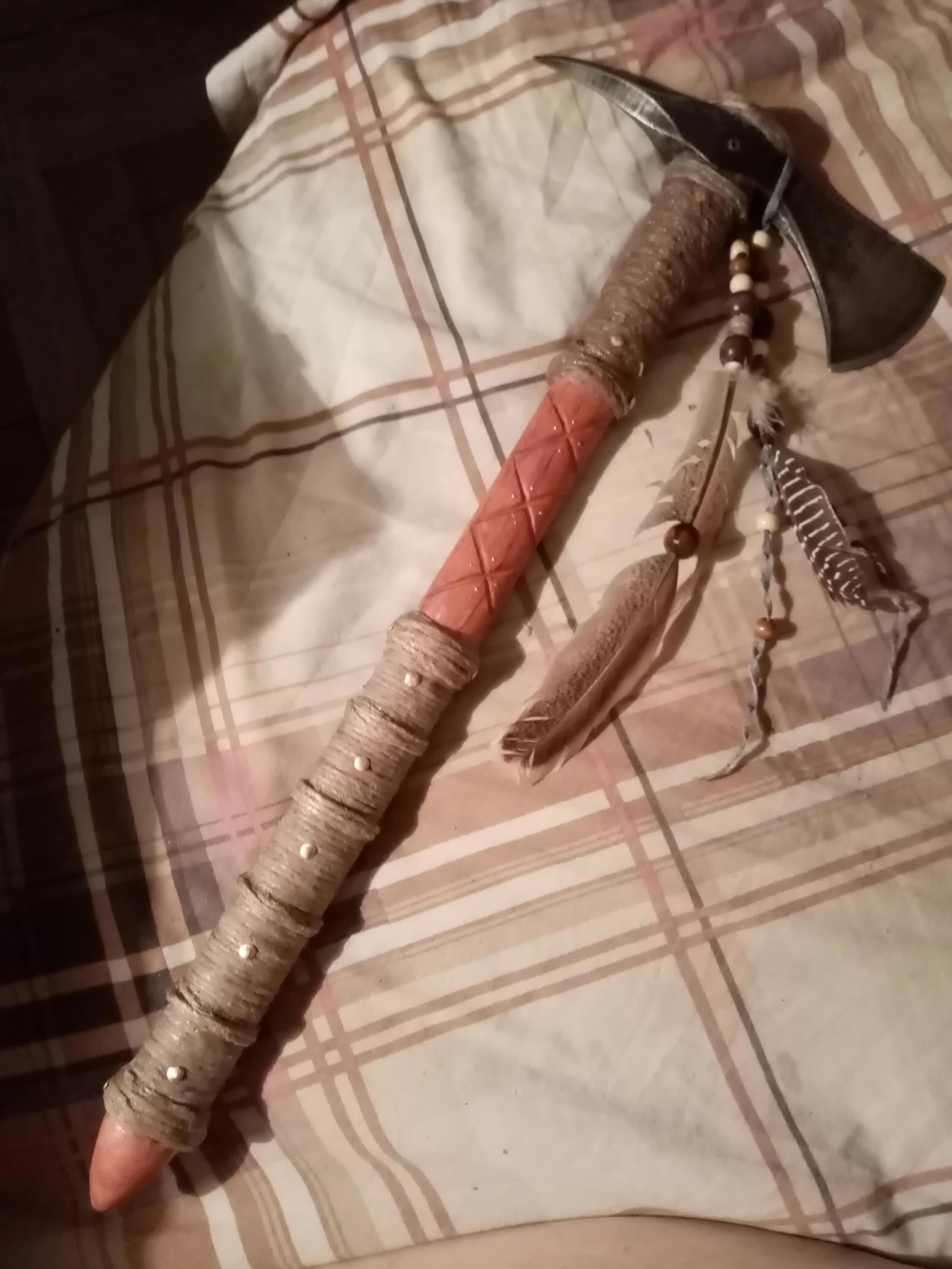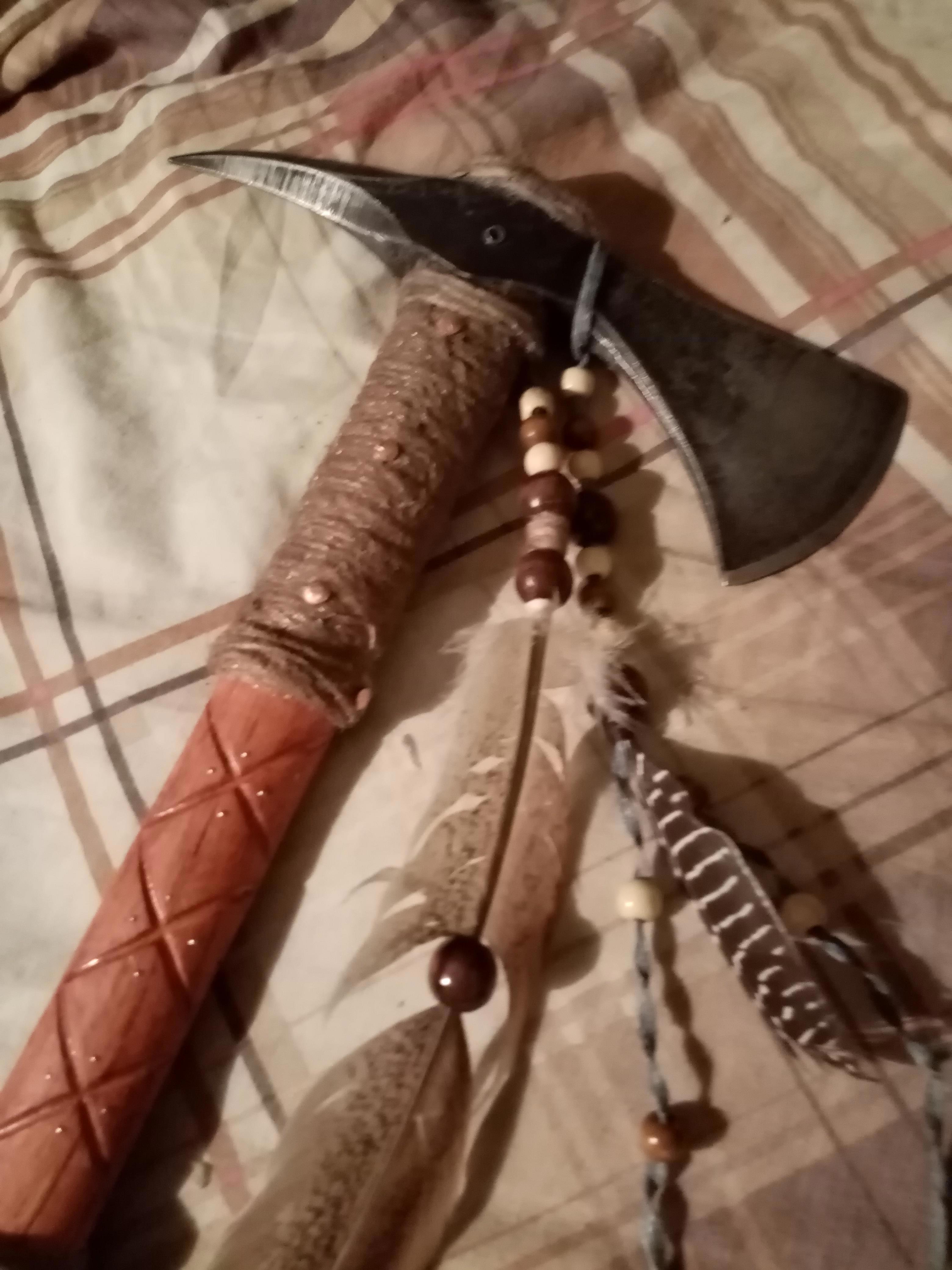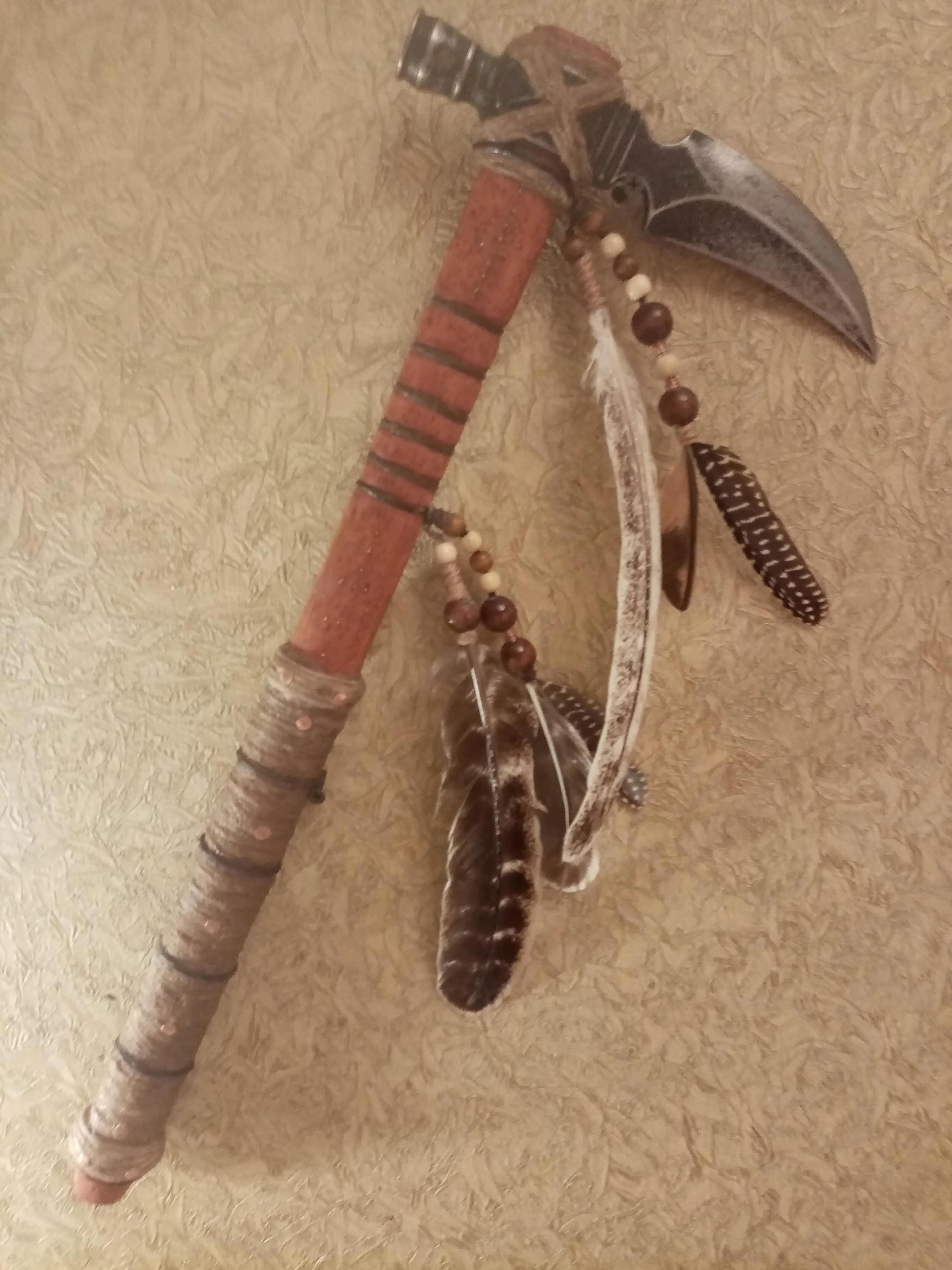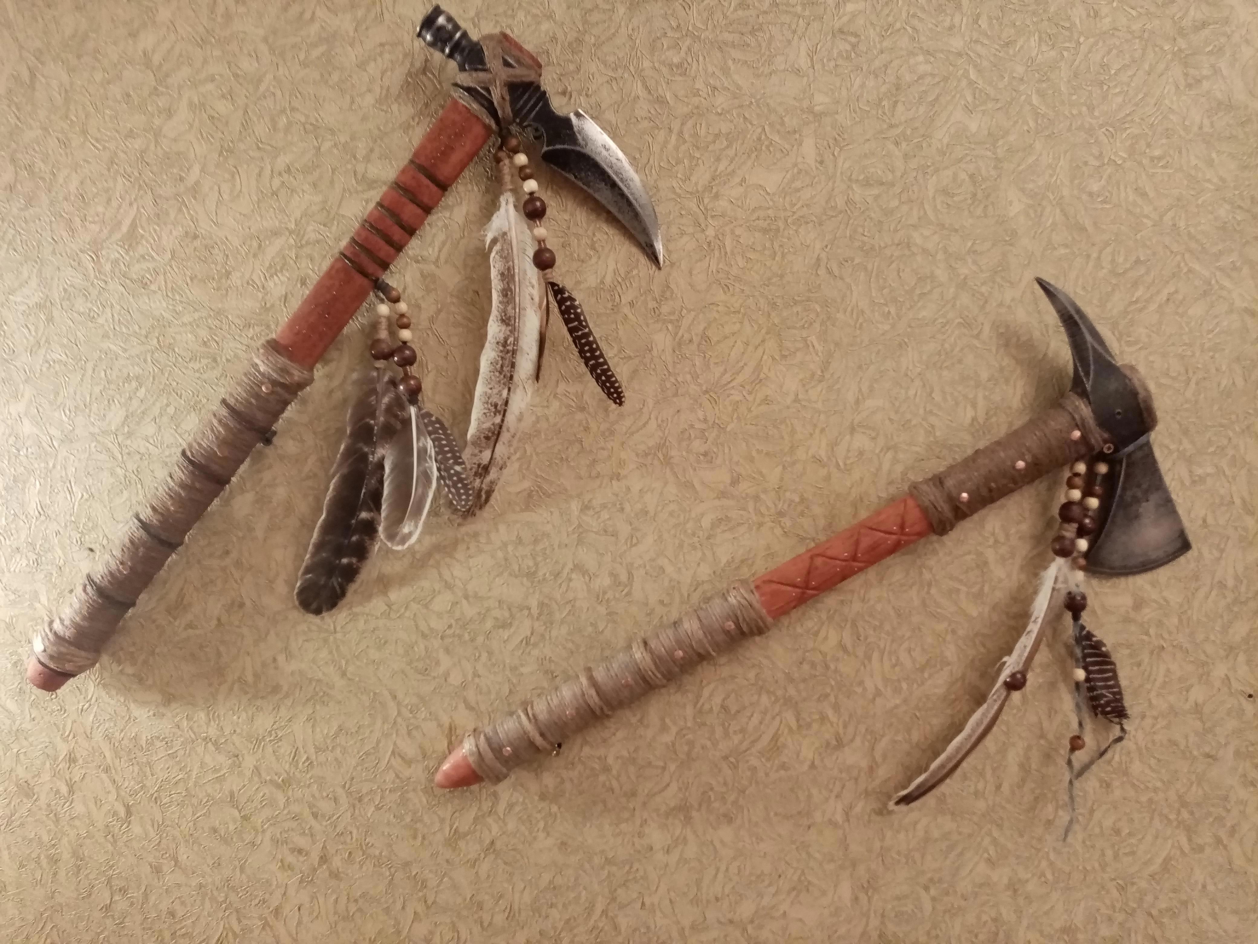 Два топорика от "Колд Стил", горсть деревянных бусин, бечёвка, эпоксидка, медные гвозди, гусиные и фазаньи перья - и вот результат.