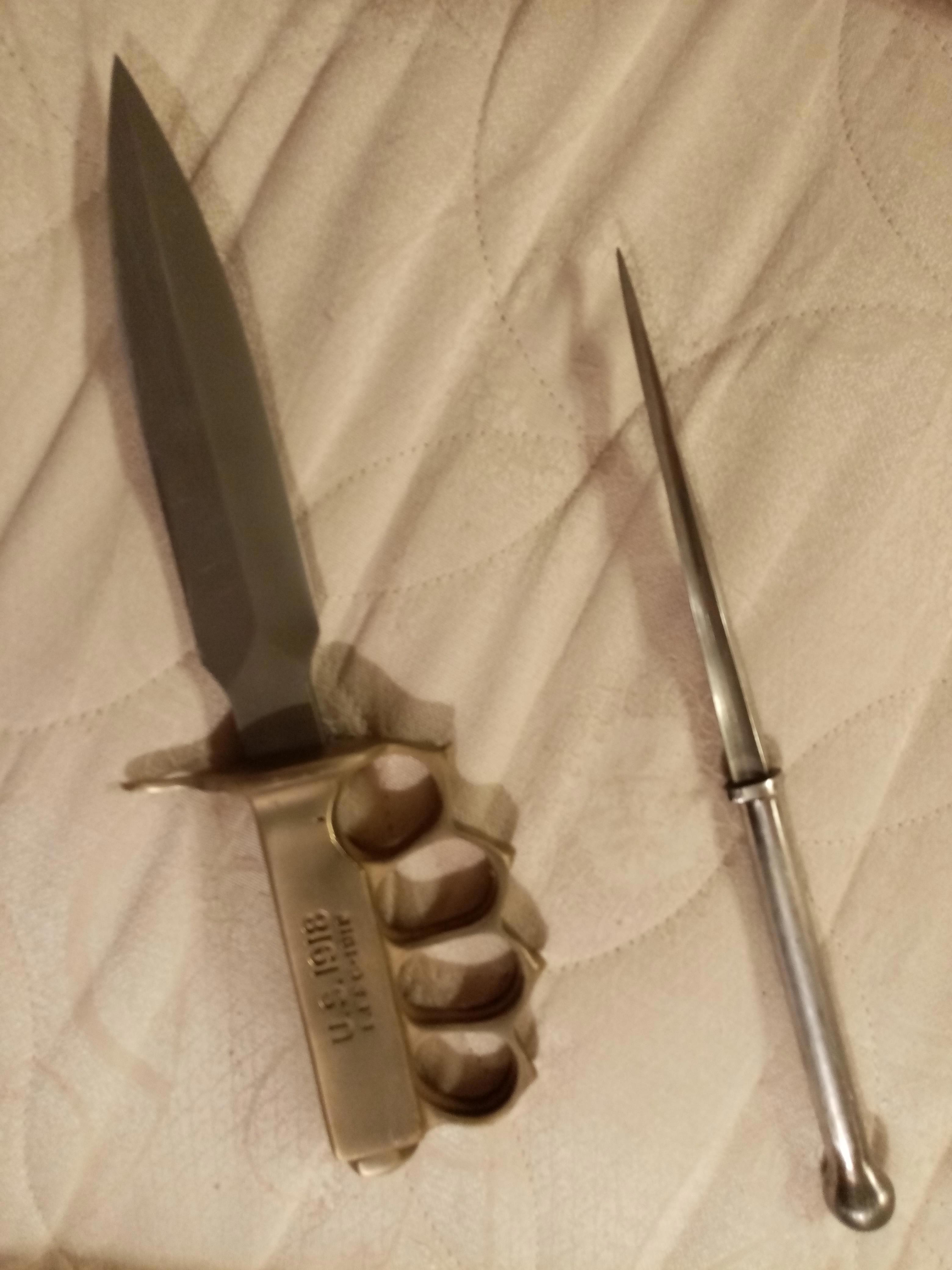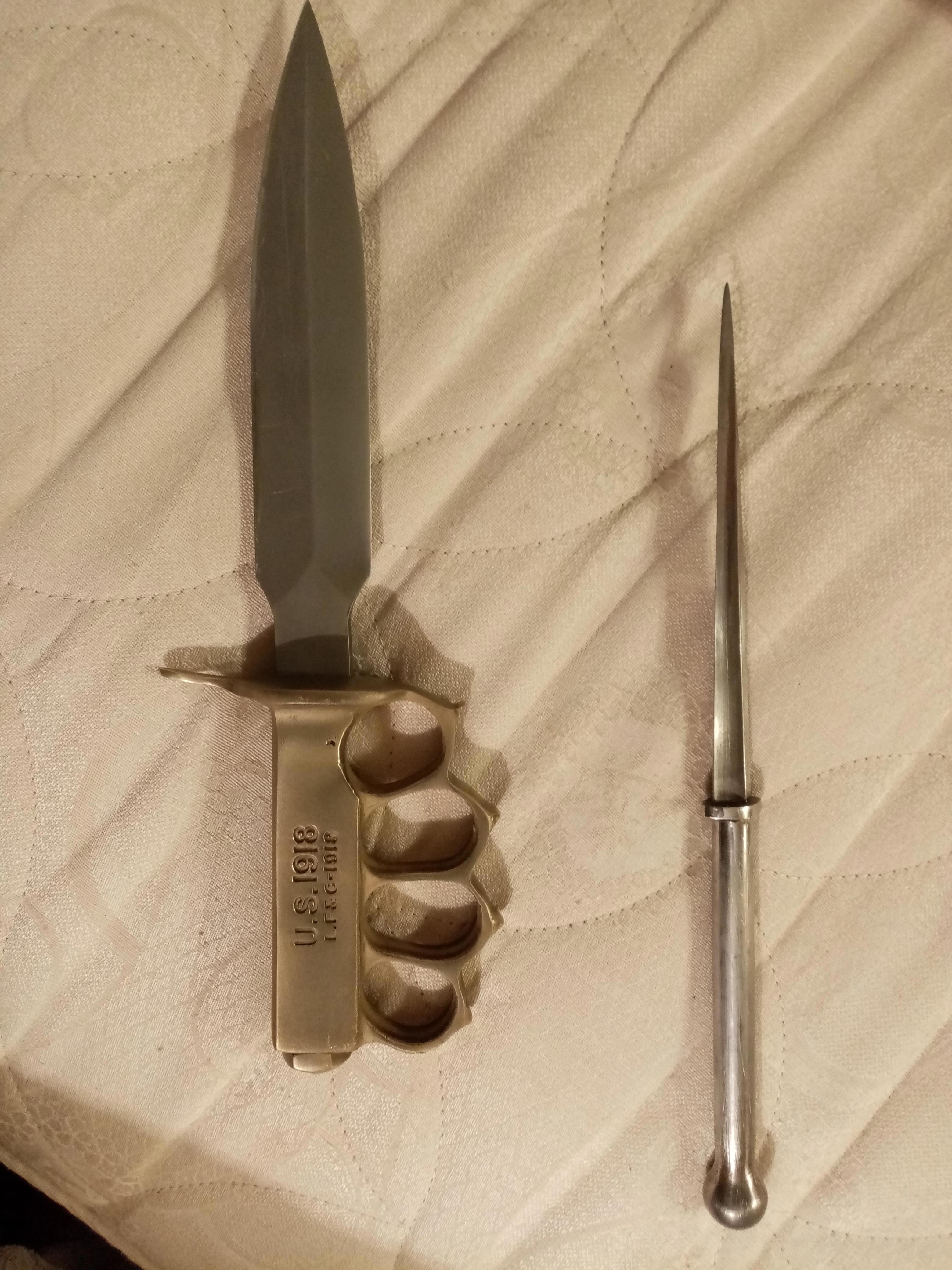 стилет из обломка штыка от трёхлинейки и американский штатный траншейный нож-кастет.