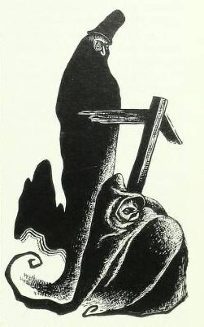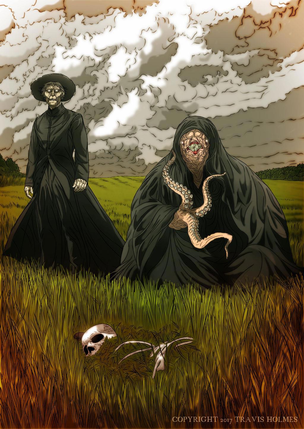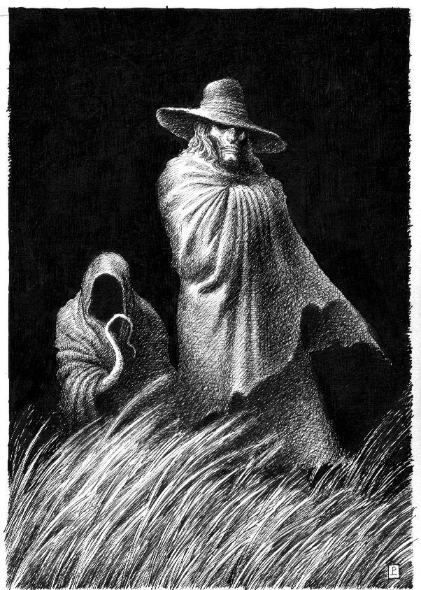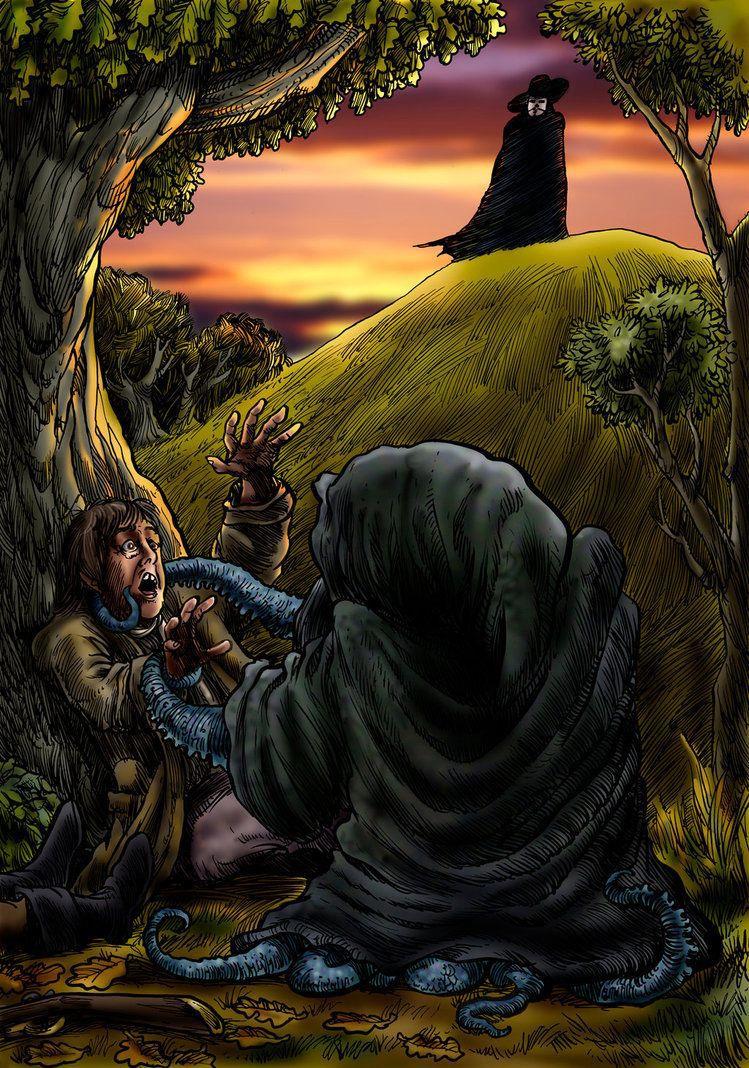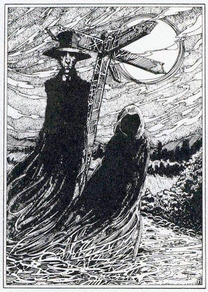 Собственно, именно этой мрачной парочке, следующей за мистером Рексоллом (легко угадать в ней немёртвого графа и его фамилиара из Хоразина), и посвящено большинство иллюстраций к рассказу.