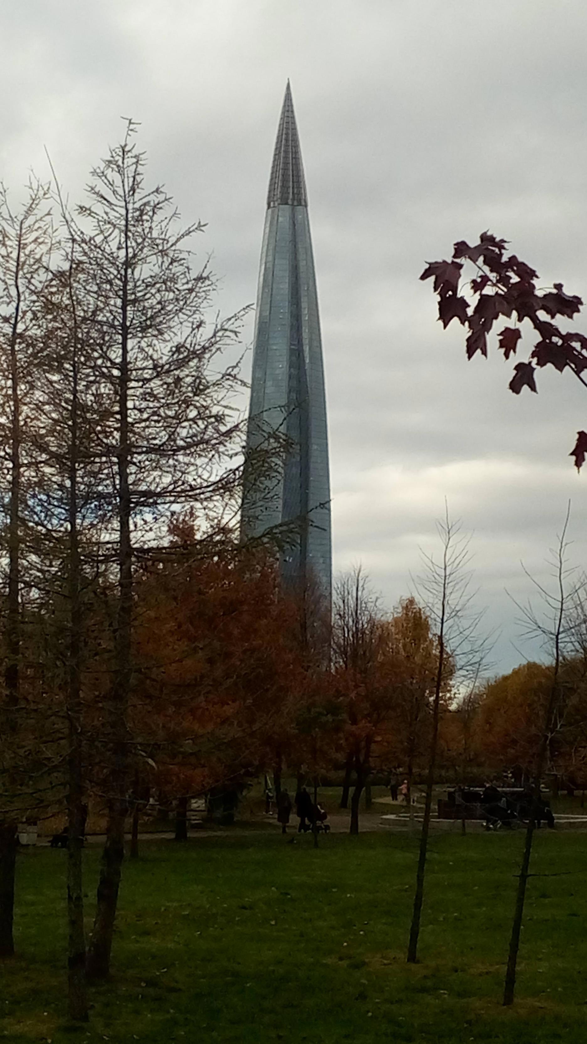 «Кукурузина» в своих серых тонах при такой погоде смотрелась не так угрожающе фоном для парка 300-летия Петербурга. Было пасмурно, похолодало.