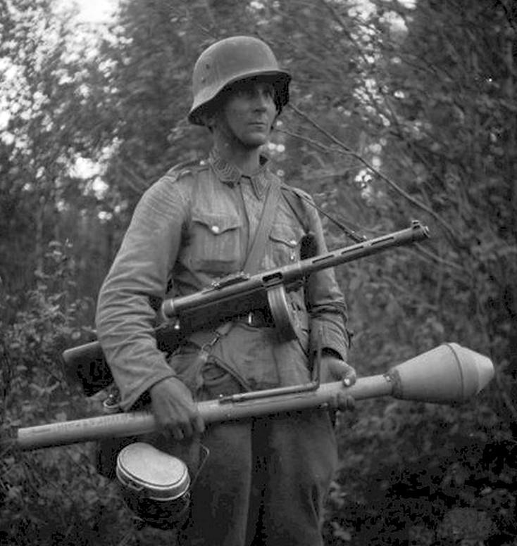 Был учтён также опыт использования гранатомётов против пехоты и гранаты стали снабжать специальными «рубашками» с насечками для увеличения количества осколков. Правда этих гранатомётов успели выпустить всего 500 штук. Однако вполне возможно, что именно такими образцами были вооружены подразделения СС, оборонявшие Берлин. Такие, как например вот этот грозный француз из 33-ей гренадёрской дивизии СС шарлемань: