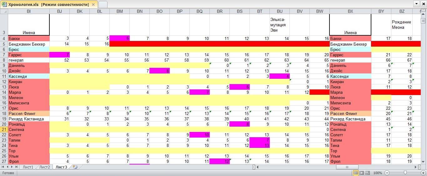 Показан временной интервал, в котором происходит действие первой части романа "Эльксарим. Дети-киборги". В строках персонажи, в столбцах время - каждый столбец = 1 год. На пересечении строки и столбца, соответственно, можно узнать, сколько лет было персонажу в определённом году. Пустые ячейки жёлтого цвета - персонаж ещё не родился. Красного - персонаж уже умер. Малиновым отмечены года элькса-мутации пант. Соответственно, эта табличка позволяет не запутаться в том, сколько кому лет на момент какого-либо описываемого в произведении события.