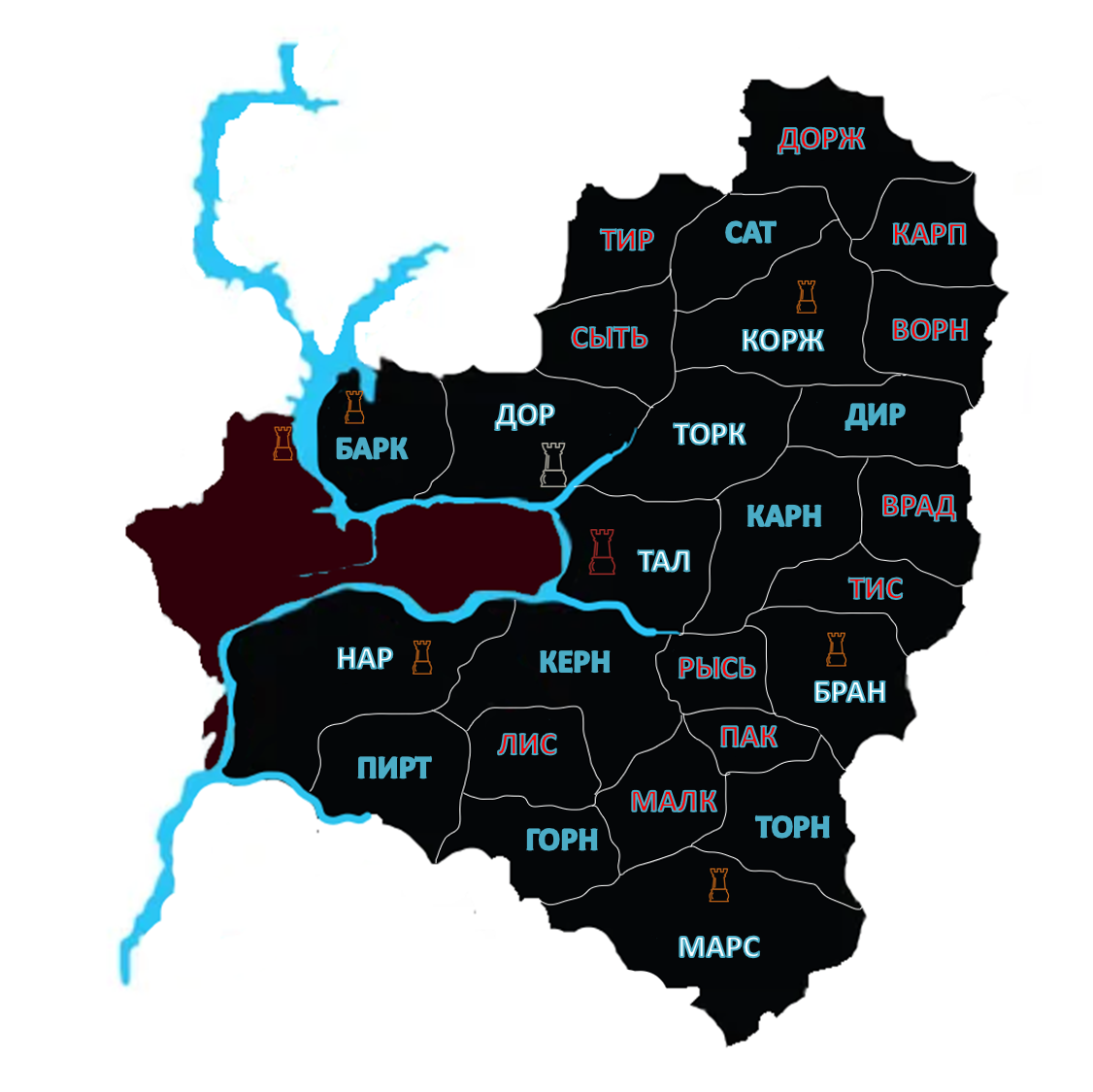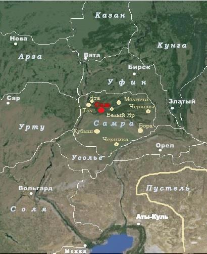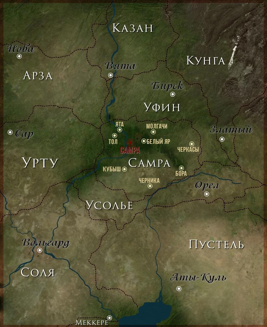 Это - Самра по территориальному устройству благих родов. Как известно, Самра - государство феодального характера и земля в нём "отдана" местным благим родам в кормление и поддержание водного баланса. Ну и люди, живущие на этой земле, автоматически являются подопечными, работниками, слугами и ратниками благих господ. Многие рода "представлены" в Самревщине (столице) - т.е. там построен их Дом - небольшое строение + подворье + сад. Там обычно живёт на постоянной основе официальный представитель рода при дворце - участник совещаний, посланник от рода, разруливатель мелких неурядиц меж родами. Но большинство людей рода живут на своей земле - где и находятся их родовые поместья. Не везёт в этом вопросе, пожалуй, сейчас только Яр-Талу... Его земля - "мёртвая", возле старого городища, где люди предпочитают не селиться. Поэтому с давних времён сарь давал этому семейству дома для охоты и отдыха в других местах. Но, конечно, свои люди и подворья есть и у него. Всё ж таки - один из высоких родов! Но в данный момент вынужден жить во дворце (практически - на работе, аха), поскольку его Дом - официальный при дворе - разрушен огнём.