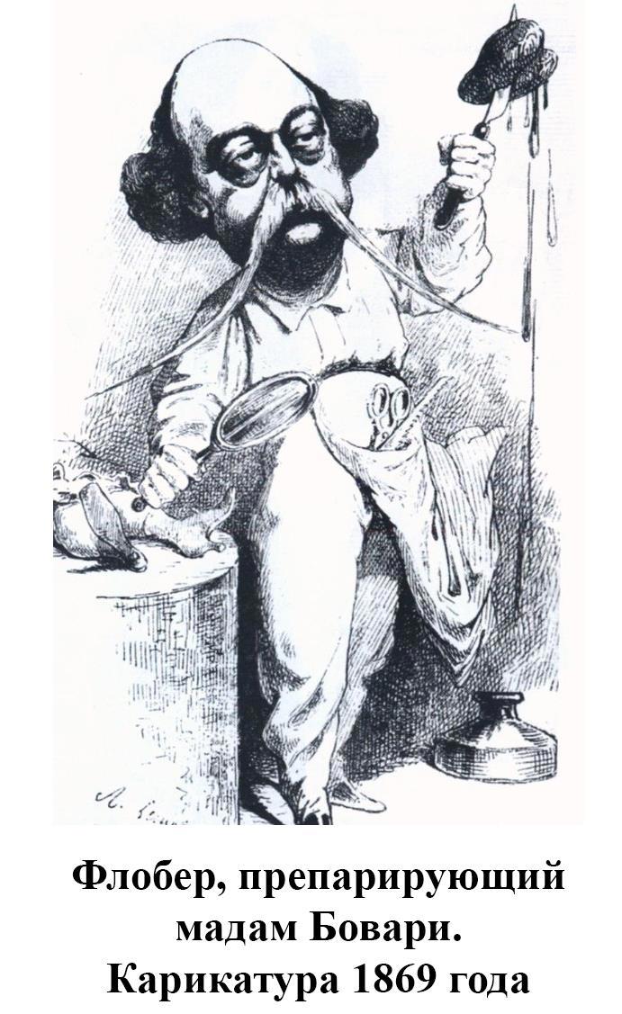 Тщательность изображения характеров, точная до беспощадности прорисовка деталей (в романе точно и натуралистично показана смерть от отравления мышьяком, хлопоты по приготовлению трупа к погребению, когда изо рта умершей Эммы выливается грязная жидкость, и т. п.) были отмечены критикой как особенность писательской манеры Флобера. Это отразилось и в карикатуре, где Флобер изображён в фартуке анатома, подвергающим вскрытию тело Эммы Бовари.