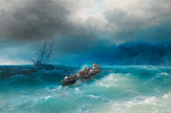 А еще пером и акварелью здорово получались волны. Я чувствовал себя новым Айвазовским. Недаром я два раза был в его музее в Феодосии. "Шторм на Черном море". 1893 - Иван Константинович Айвазовский.