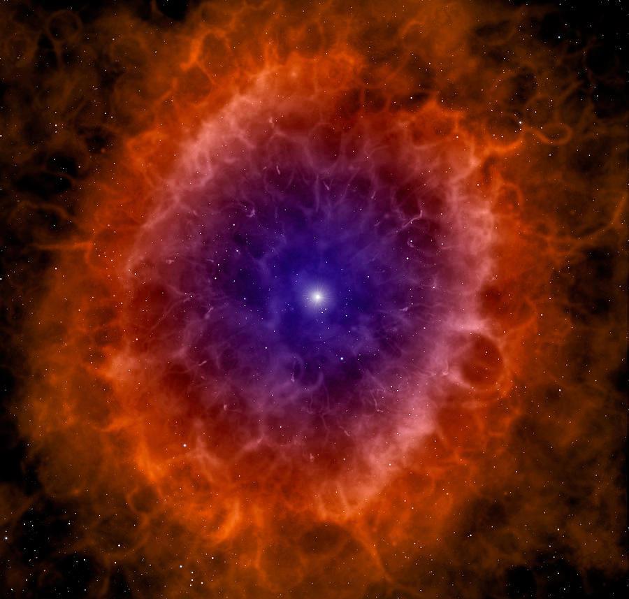 Видите маленькую голубую звездочку в центре этого "глаза". Это то что осталось от звезды прожившей свою жизнь. Она еще будет светить несколько сот миллионов лет, пока не выработает остатки своего термоядерного горючего.