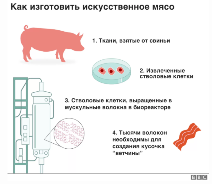 Уже с 2013 г. выращивают мясо без самих животных - это так называемая «тканевая инженерия». Например, берут мышечные клетки, собранные у животного, и растят готовые мышечные ткани в специальных резервуарах биореактора, в богатом питательными веществами «бульоне».