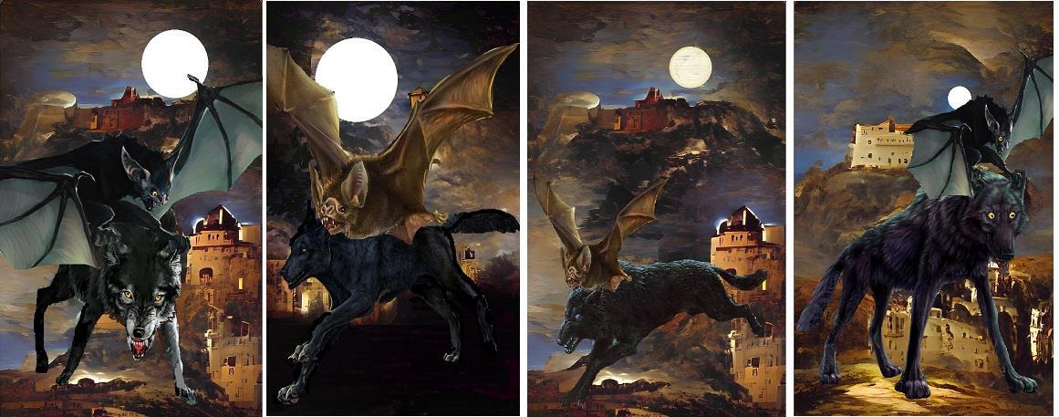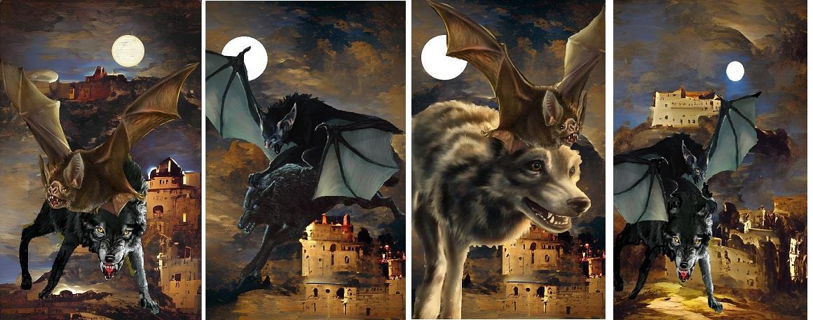 В данной сцене дружки -  нетопырь-вампир и оборотень волка - догоняют вора.  Вампир устал и  вцепился в волчьи уши. Поэтому ценно максимальное совмещение лапки нетопыря и волчьего уха, а затем важно правильное композиционное  и цветовое решение.