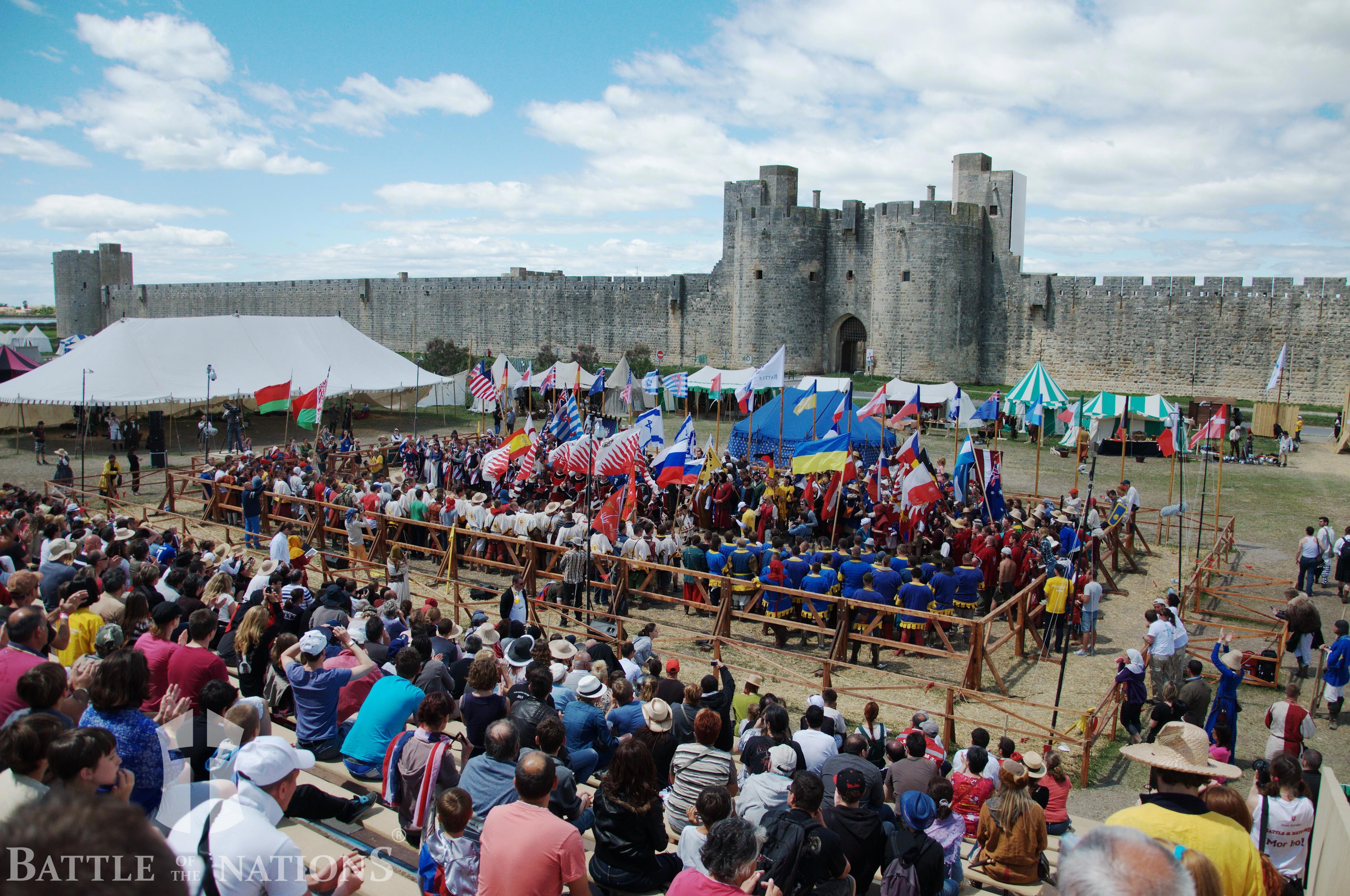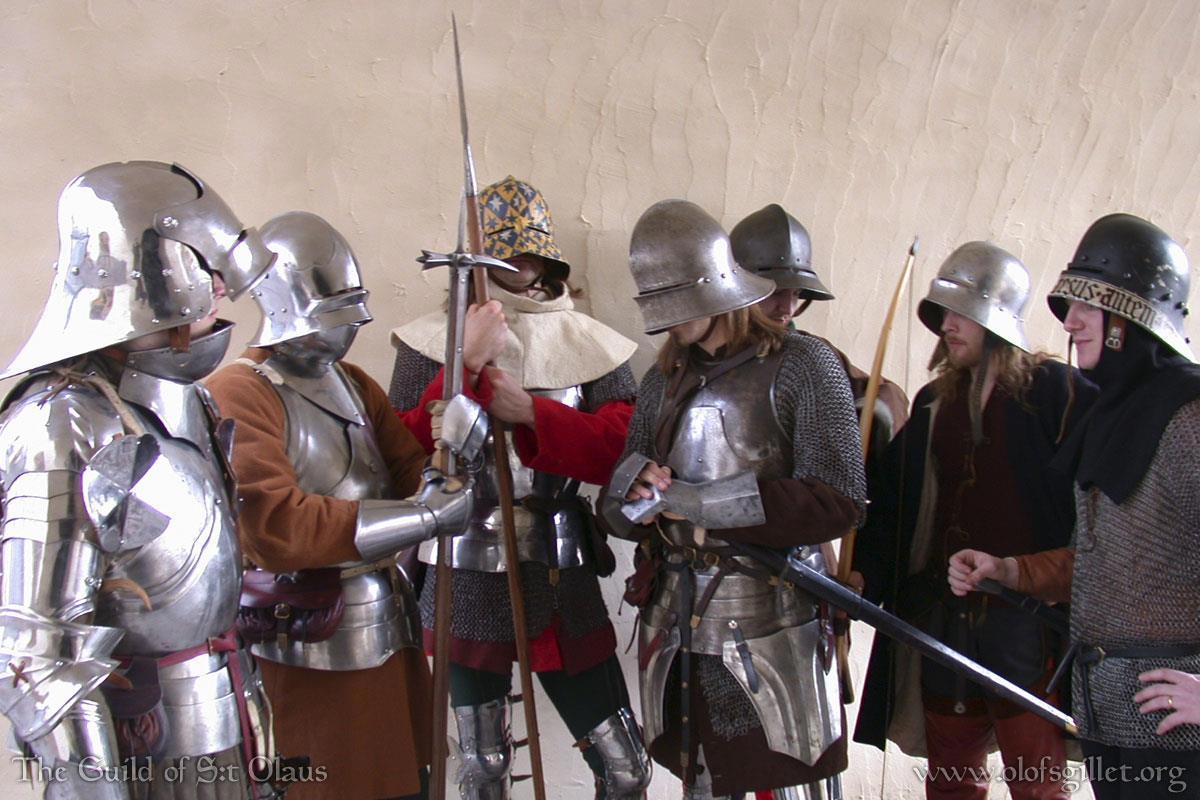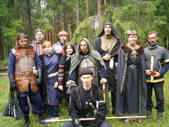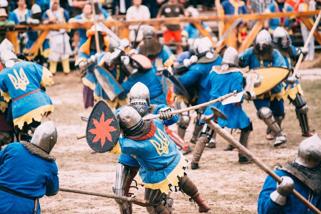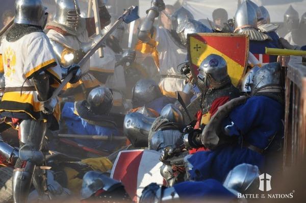 Бугурт, то есть бой двух команд. Контактный. Оружие все же не вполне боевое, но вмятины на шлемах говорят сами за себя.