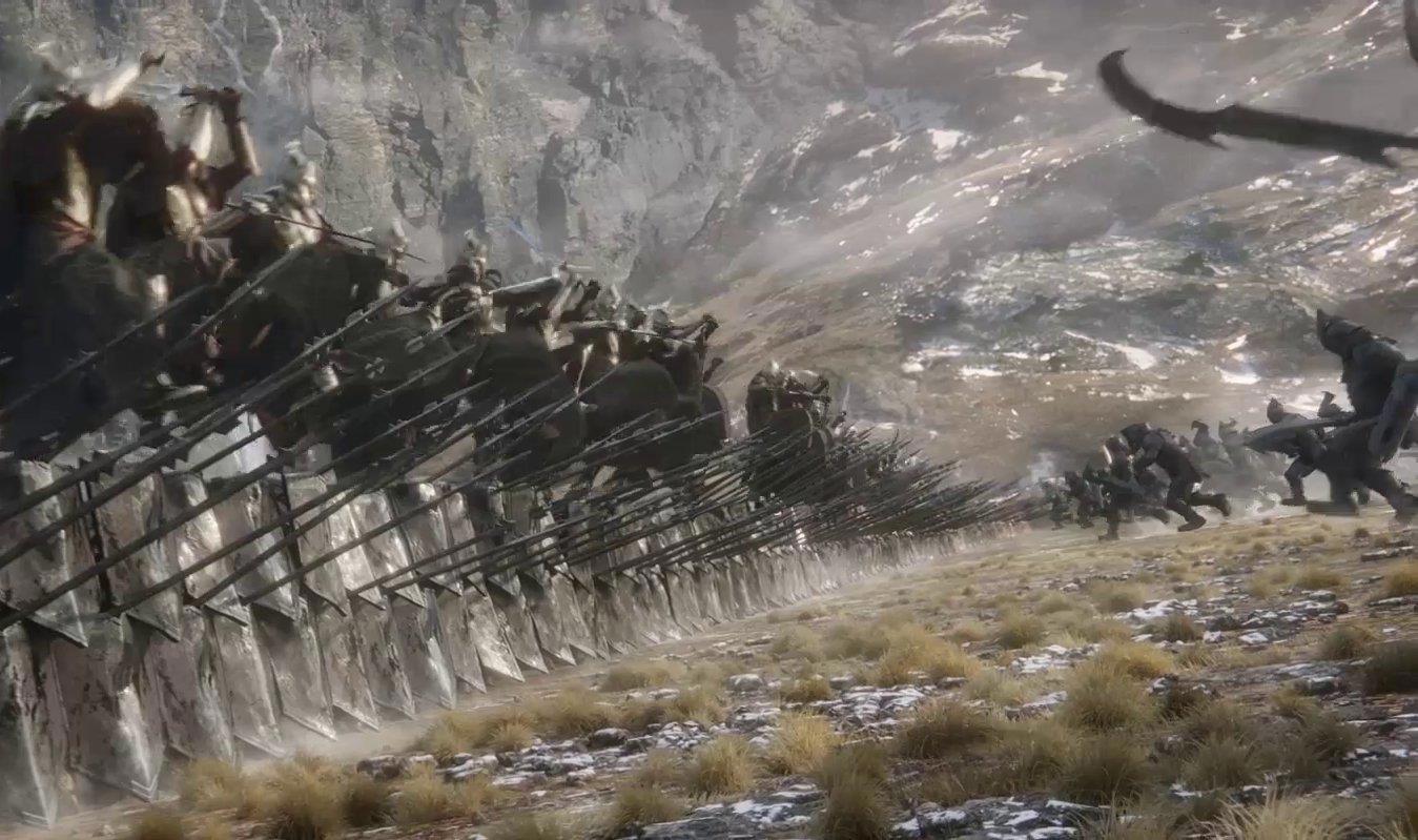 Кадр из фильма "Туда и обратно" - эльфы перепрыгивают через строй панцирных гномов-щитоносцев навстречу бегущим оркам.