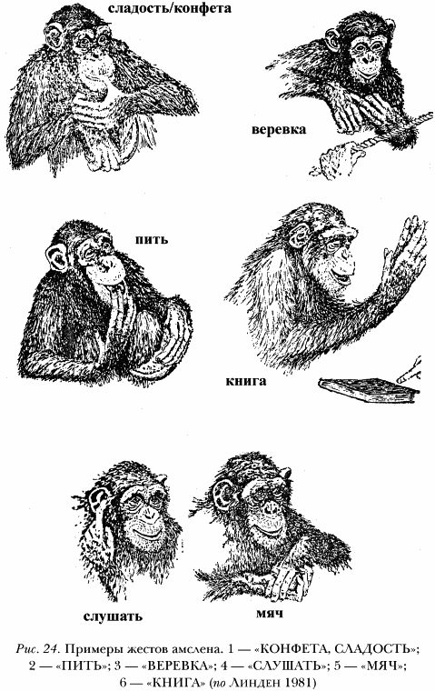 Некоторые обезьяны способны выучить до 100 понятий и передать их определенными жестами человеку.