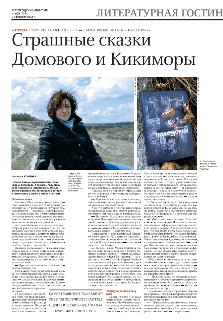 Автор: Наталья СабанцеваС утра коллеги порадовали. Разместили "меня" в "Литературной гостиной" газеты "Белгородские известия". Интересно, что именно там я начинала свою работу - давно это было. Теперь я на странице газеты в качестве героя - автора "Полозовки". которую выпустило издательство "Анимедиа".