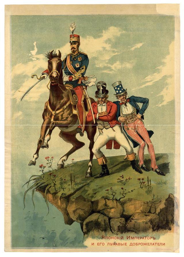 Англичанин и американец подталкивают японского императора в пропасть - то есть на войну с Россией.