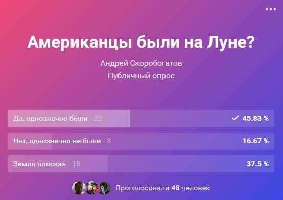 На ВК (там было можно добавлять и третий вариант, и до конца непонятно, какой процент реально верит про Плоскую землю, а какой прикололся или тыкнул в него как вариант "посмотреть ответы")