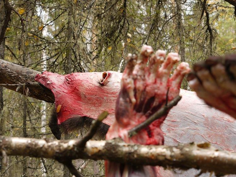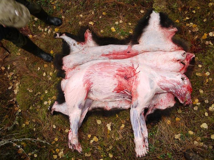 Медведь со снятой шкурой. Видно огнестрельное ранение.