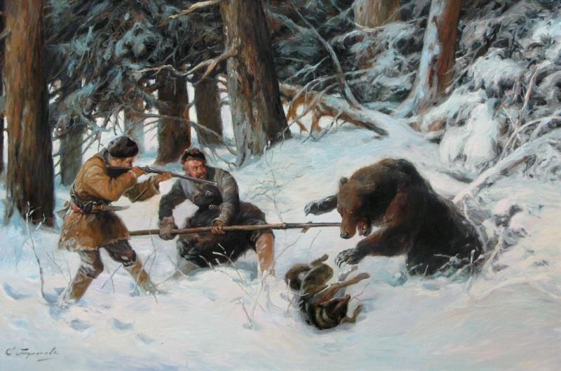 Охота на медведя. У охотника как раз в руках рожон.