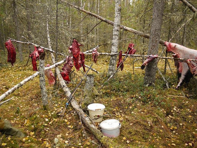 Мясо развешено на сучьях.