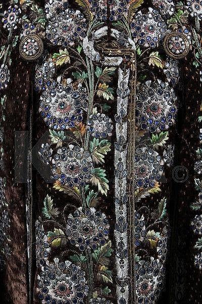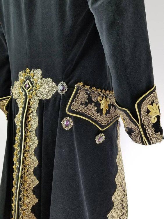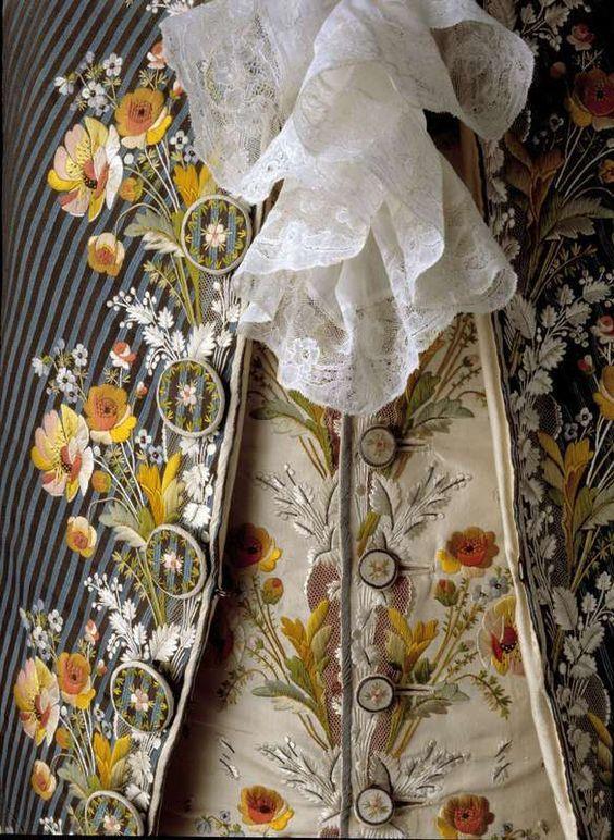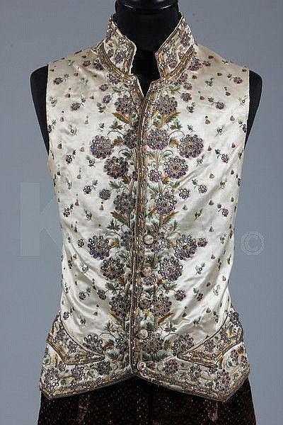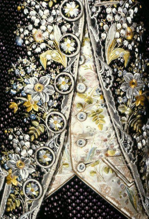 Ещё немного деталей придворного костюма джентльмена, французский около 1790 года, состоящий из: темно-коричневого бархатного фрака с великолепно вышитыми и переливающимися цветами и листвой, украшенными вставками из пасты, подходящих бриджей и атласного жилета, грудь 86 см, 34 дюйма, талия 66 см 26 дюймов