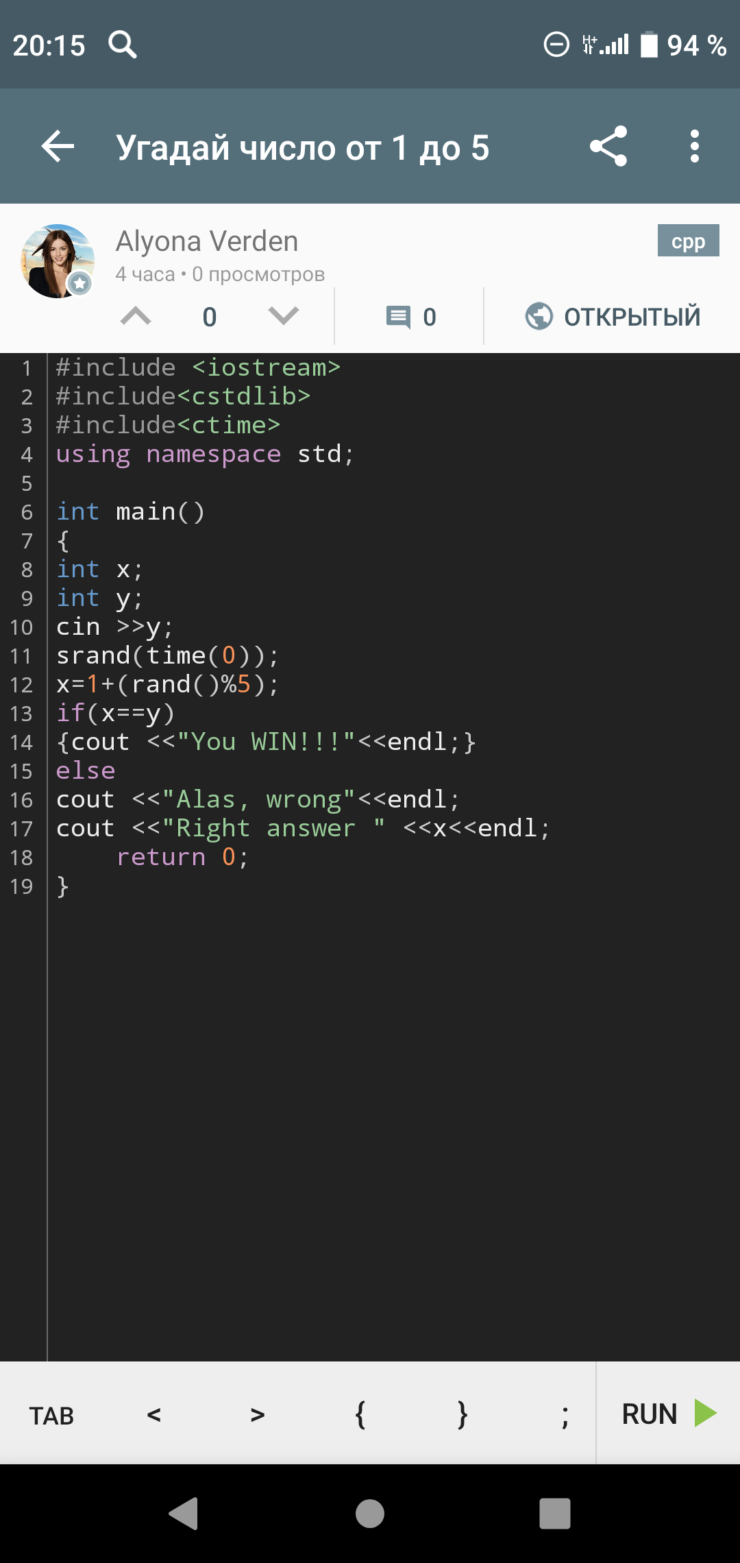 Ещё состряпала "Угадайку" - надо ввести число от 1 до 5, компьютер в это время "загадает" случайное число, а потом ответит, угадала я или нет.