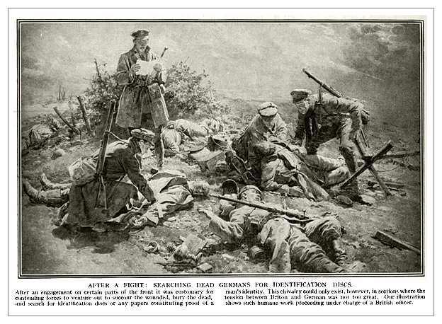 После боя - британские солдаты роются в карманах убитых немцев. Это не мародерство, просто на войне так принято. (Вот когда немцы роются в карманах убитых англичан - это бесспорно мародерство!) В принципе все бумаги положено сдавать в штаб - может оказаться ценностью для разведки. Но часто этим не заморачиваются - как трупы - так вокруг бумажки - документы, письма, фото...
