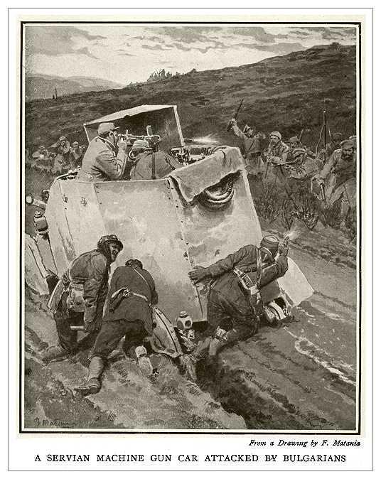 Сербский броневик атакован болгарами. Матиния рисовал или с натуры, или перерисовывал фотографии, его рисунки максимально точны - это была его фишка. Так что, у сербов, наверняка, были такие броневики. К примеру http://derela.pl/peugeot.htm