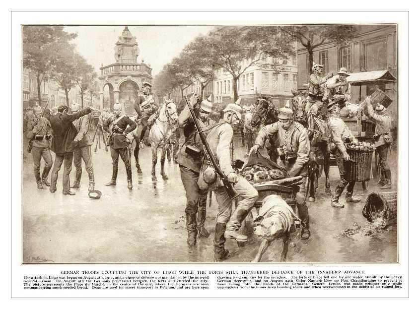 Германские оккупанты на улицах Льежа. Характерная деталь того времени - собаки в виде транспортного средства у лавочников.