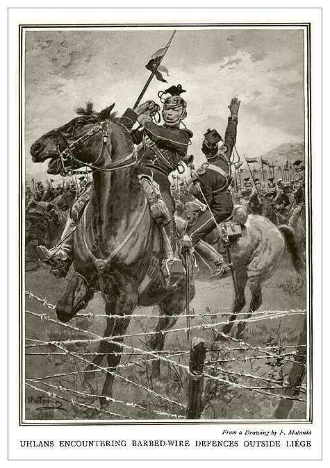 Бельгийские уланы напоролись на колючую проволоку во время обороны Льежа. В 1914 году лихие кавалерийские рейды еще имели место быть. Проволока и пулеметы быстро растрепали блестящую кавалерию.