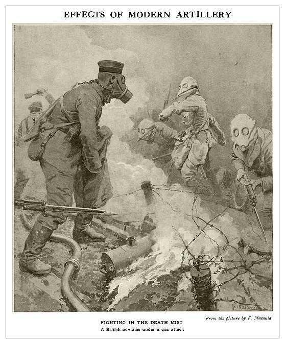 "Схватка в смертельном тумане" - в годы Первой мировой химическое оружие нашло массовое применение. Название "Эффекты современной артиллерии" тут двояко - намекает и на применение отравляющих веществ в снарядах и широко распространенную в войне "карманную артиллерию" - ручные гранаты.
