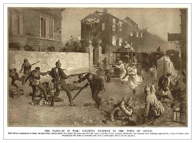 Парижские такси с зуавами на борту врываются в городок Сенлис. Знаменитое "чудо на Марне" случилось в 1914 году во многом благодаря мобилизации парижских такси. Но, если верить этой картинке, такси играли роль не только транспортных средств - они еще и "первыми врывались в города".