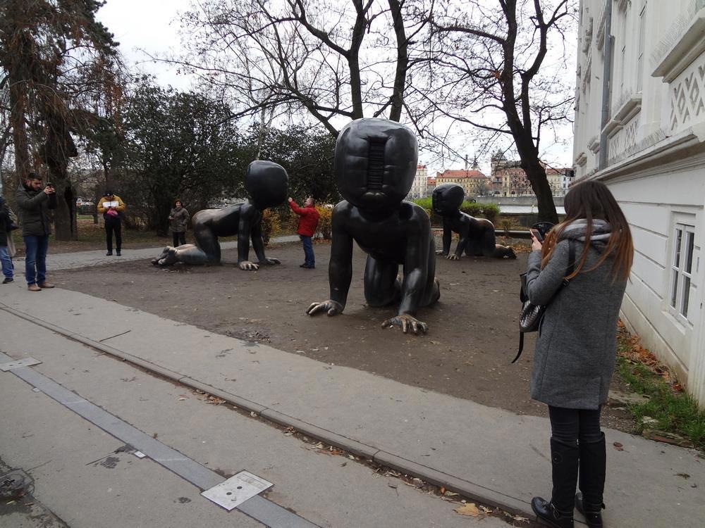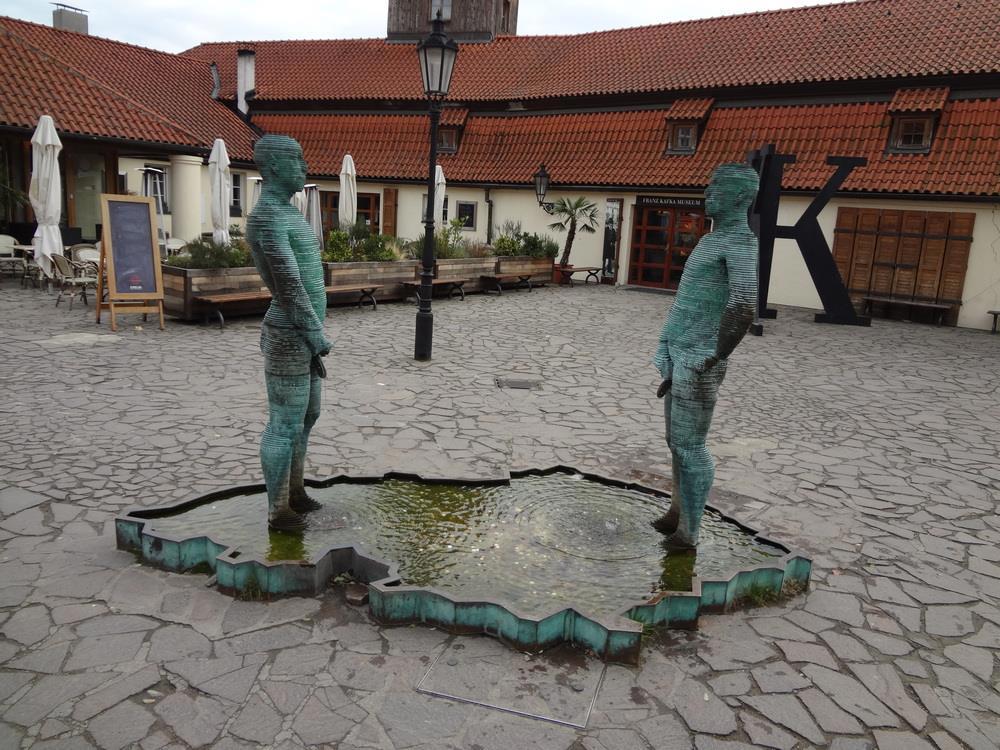 Вообще странное ощущение деградации при сравнении старого искусства и новых потуг совершенно идиотского исполнения. Совсем уж бредятину не снимал, но и вот эти - нашумеввшие и разрекламированные - ну ни уму ни сердцу. Два литературных деятеля ссут в бассейн контурами повторяющий Чехию. Фонтан, ага. Автор - тот же самый. что покрасил снятые с памятника советские танки в розовый цвет, ага. Ну очень креативный. Музей Кафки на заднем плане.