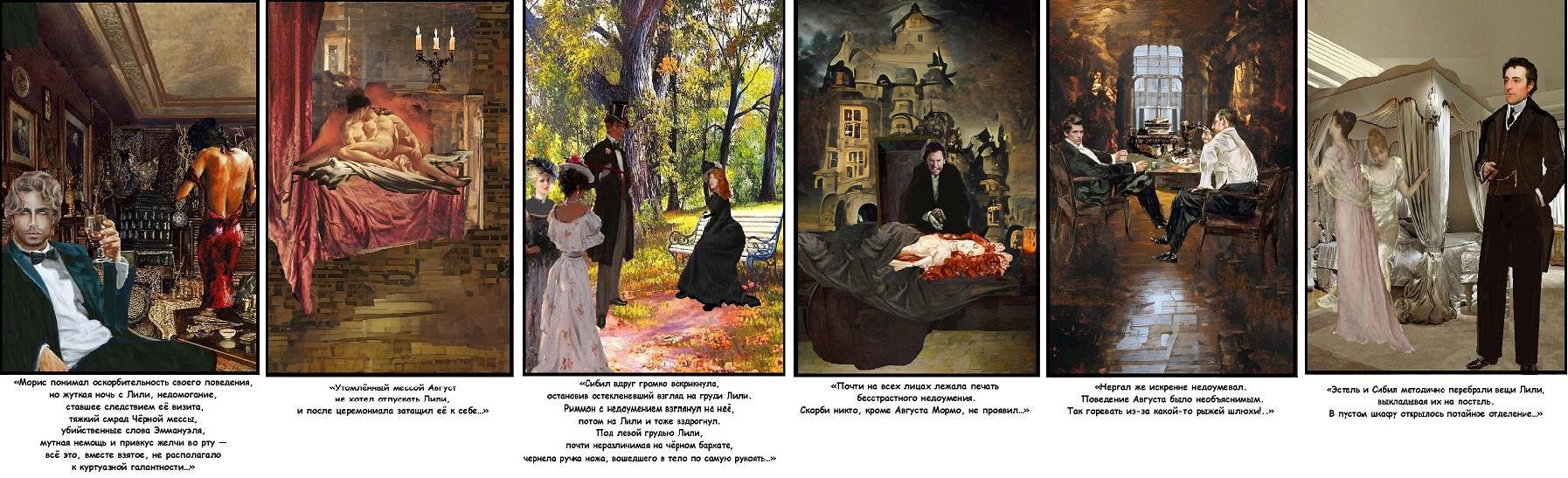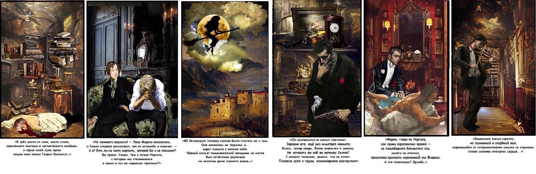 Через все части романа проходит идейка шахматной игры, и она тут воплощена без ИИ: его шахматы оказались пугающими. Дальше иллюстрации распределены по главам, но с привязкой к отдельным эпизодам, и потому иногда к одной главе сделано (не считая дюжин дублей) две иллюстрации, а к другой только одна. Показываю в половину натуральной величины. Итак...