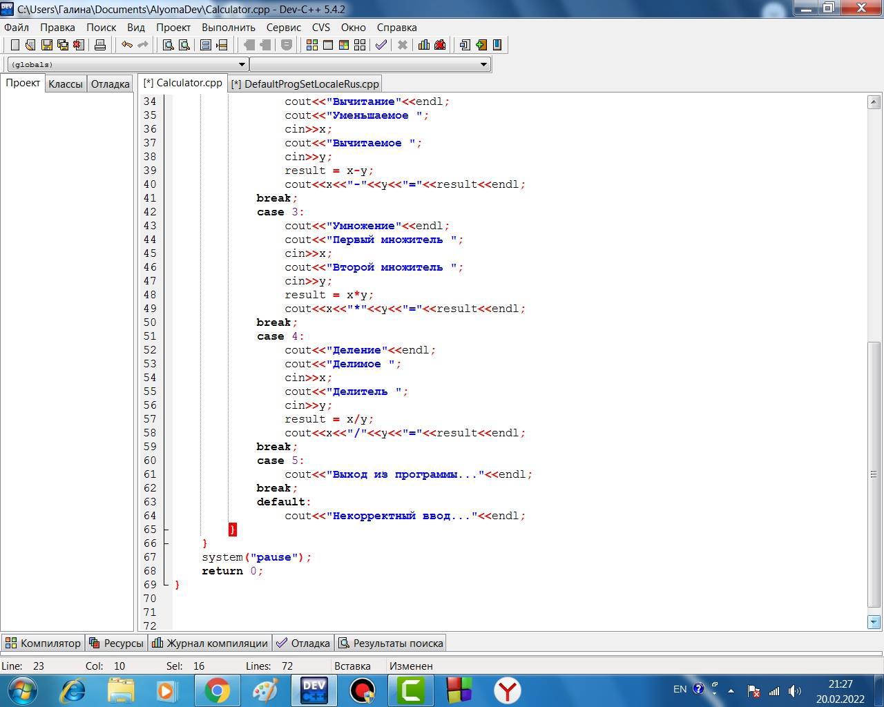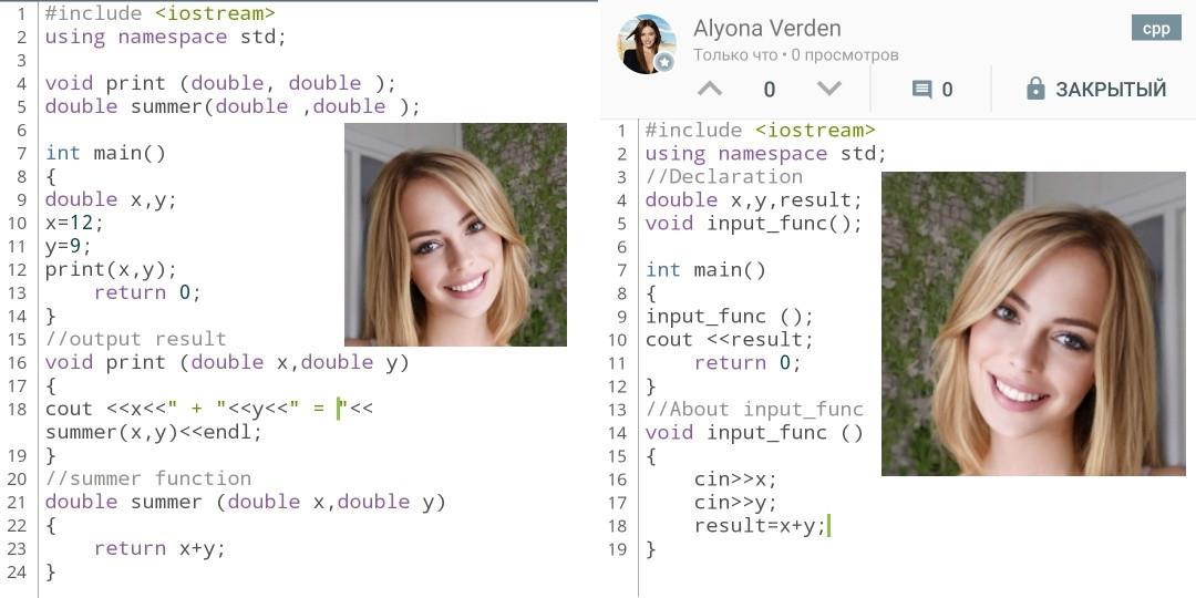 А теперь новое. По поводу применения функций - в этой программе они в принципе особо не нужны. Преследую чисто учебные цели, сократить код и уменьшить количество объектов cout и cin. Вот такая задумка, и такие примеры, сделала в песочнице Solo Learn сегодня, теперь буду переделывать проект на компьютере.