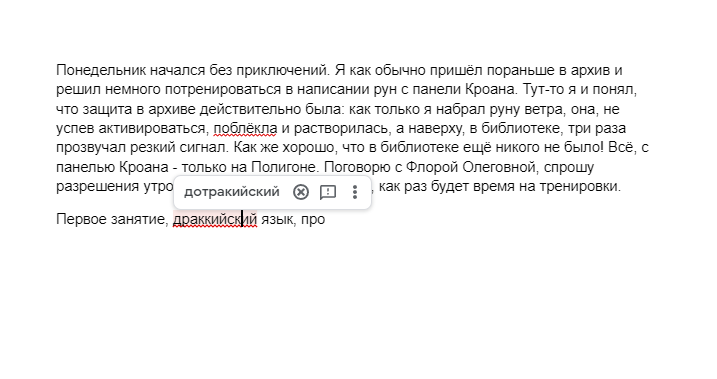 Автор: Антон ИсаевСловарь Google Docs, конечно, удивляет. Буква "ё" для него - иноземный символ, некоторых слов он вообще не знает (всё приходится запихивать в личный словарь), зато он знает слово "дотракийский". И услужливо предлагает его мне. Ну не зараза ли?