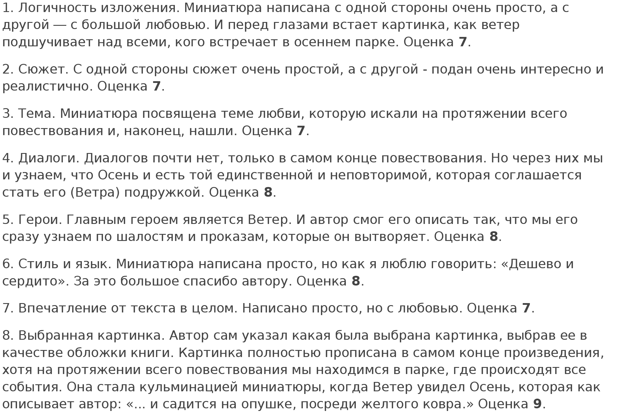 7. Впечатление от текста в целом. Еще раз повторюсь, текст оставил хорошее и приятное впечатление. Оценка 8.
