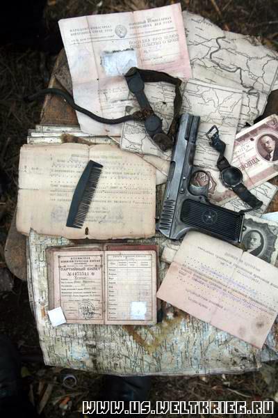 Автор: Николай БергВещи советского летчика, обнаруженные на месте падения его самолета несколько лет назад. Достаточно типовой набор вещей и документов советского военнослужащего ВВС. Сохранились в болоте идеально, только фотокарточка с комсомольского билета отклеилась. Подобное Семенов с погибшего старшины снял.
