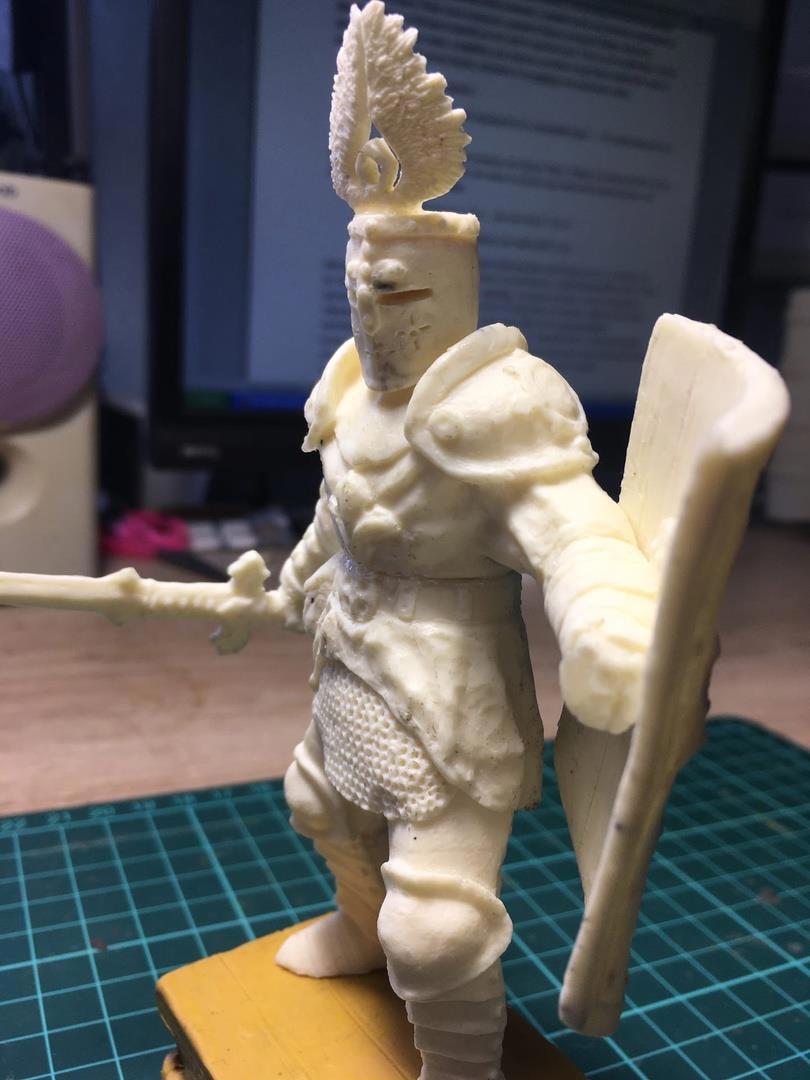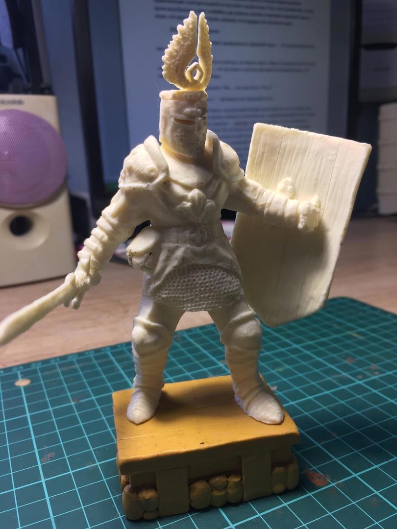 И, наконец, рыцарь в сверкающих доспехах, который на деле и не рыцарь вовсе, а скорее оруженосец или попросту латник, обзавёлся твёрдой формой. Всё ещё ломаю голову над плинтом (подставкой), но это второстепенно, на фоне удавшейся модели и лучшей на моей памяти формы. Кстати, если есть какие-то мысли касательно плинта - милости прошу в комментарии. Мнение со стороны крайне важно.