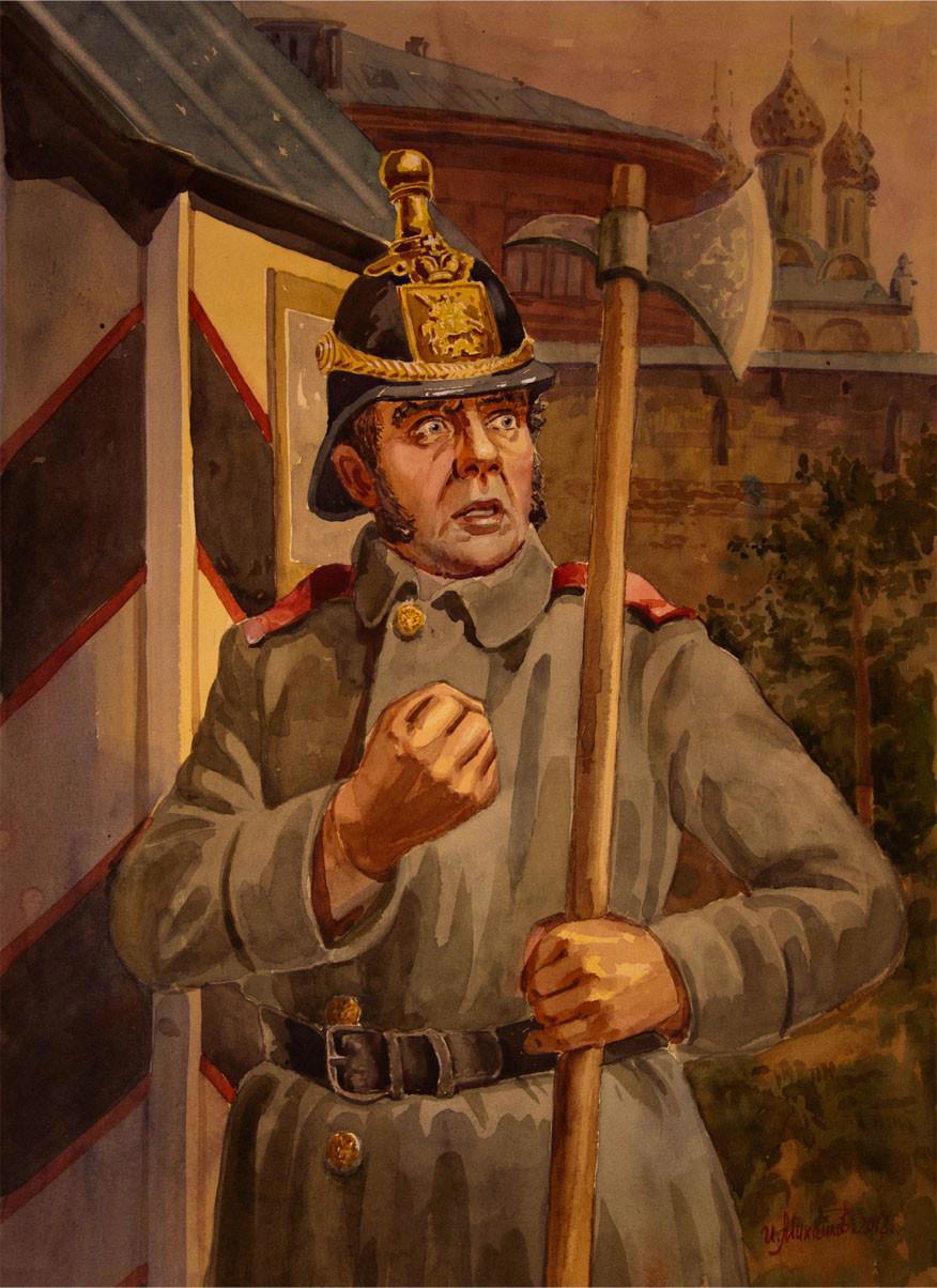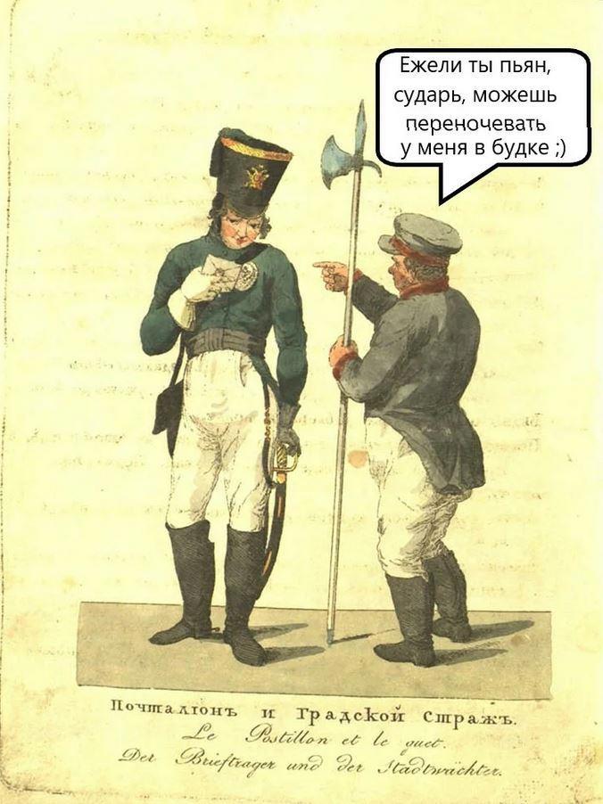 Нижние чины полиции - будочники - контролировавшие перекрестки в городах. Названы так, потому как находились стационарно и в случае непогоды прятались в будочке - на картинке выше как раз такая. И вот у этих полицейских - самые настоящие алебарды. Не могу понять - то ли какой арсенал захватили на пути в Париж и попользовали, то ли делали по заказу МВД.