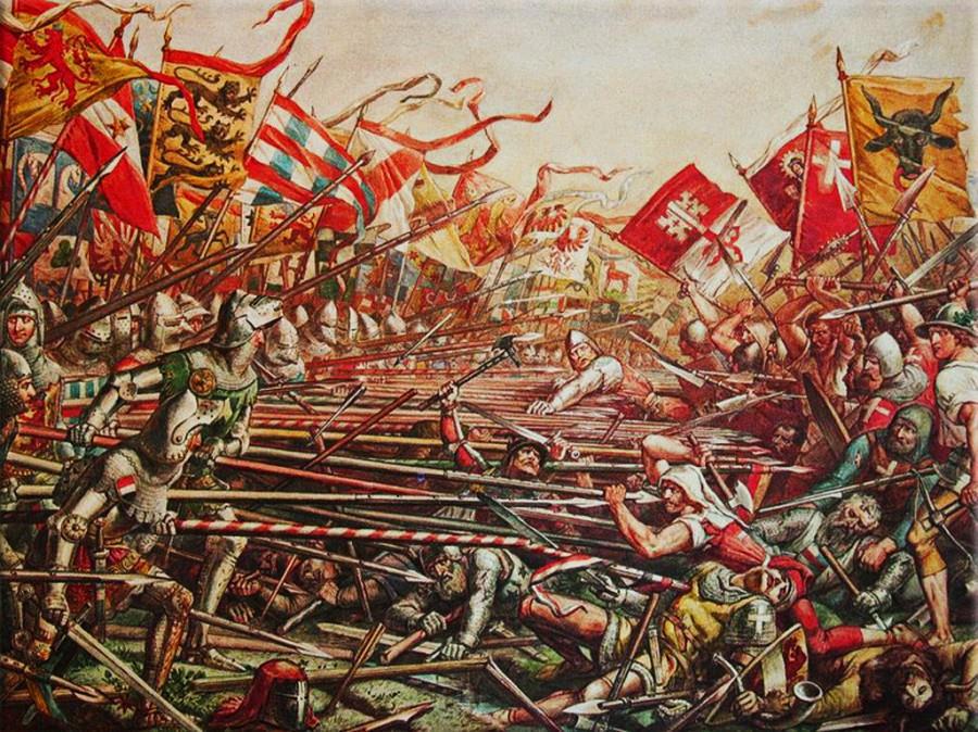 "Плохая война" с швейцарцами (картина живописует исторический факт, когда швейцарец пожертвовав собой сгреб своим телом несколько пик и дал своим товарищам прореху в немецком строе).