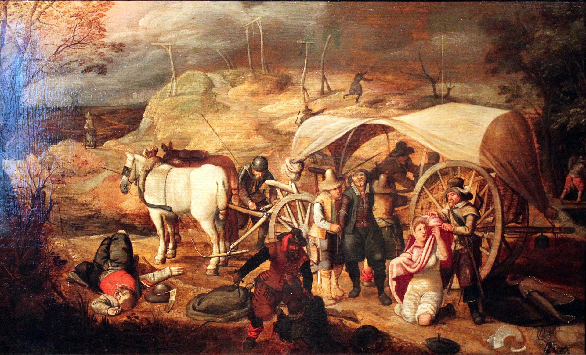 Солдаты грабят проезжавший экипаж с богатой дамой.