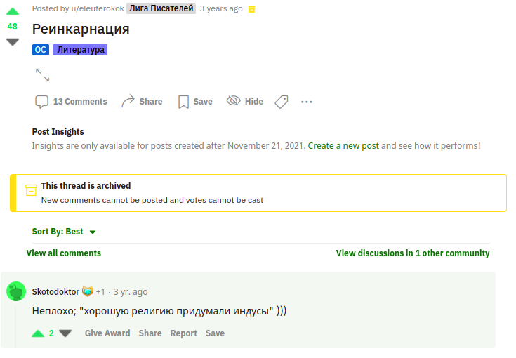 Но атмосфера свободы привлекает. Я продолжаю настаивать на том, что на творческих людей нельзя надевать ошейники и цензурировать их. Творчество возможно только в условиях свободы. Кстати, со злополучной политотой, за которую здесь, на АТ банят. Там, на Реддите ее тоже не любят: