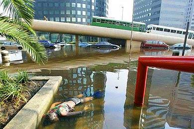Дамбы прорвало, В  одном месте разрыв более 200 метров и никто не знает насколько в  глубину; туда бросили несколько полуторатонных мешков с песком, но  поняли, что это совершенно бесперспективно. Я посмеялся, когда на ТВ  "эксперт" объяснил, что станции откачки автоматически включились, когда  вода стала прибывать -- перекачивая ее назад в озеро, из которого она выливалась в котловину города. Пока было электричество, то есть