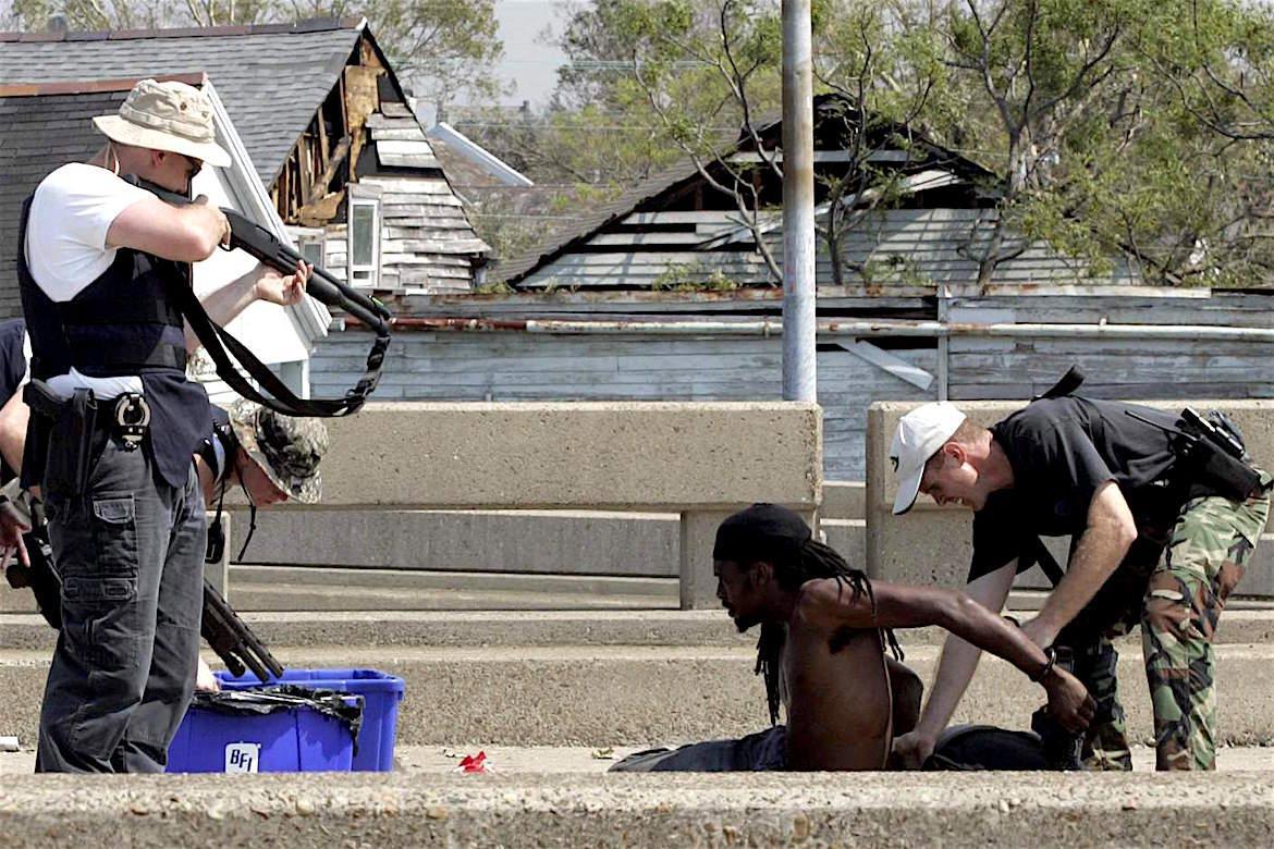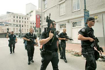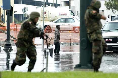 Однако три тысячи  гвардейцев проблемы не решили. Пришлось бросать на город целую армию  резервистов и добровольцев из пятидесяти тысяч человек. Сюда были  переброшены даже несколько сотен ветеранов иракской войны в полной  боевой выкладке. Люди в камуфляже ездили по не затопленным улицам на  джипах, а по затопленным – на катерах. И методично отстреливали  мародеров.(с)