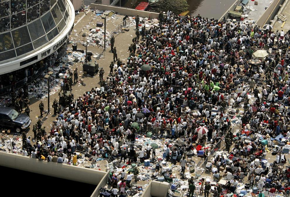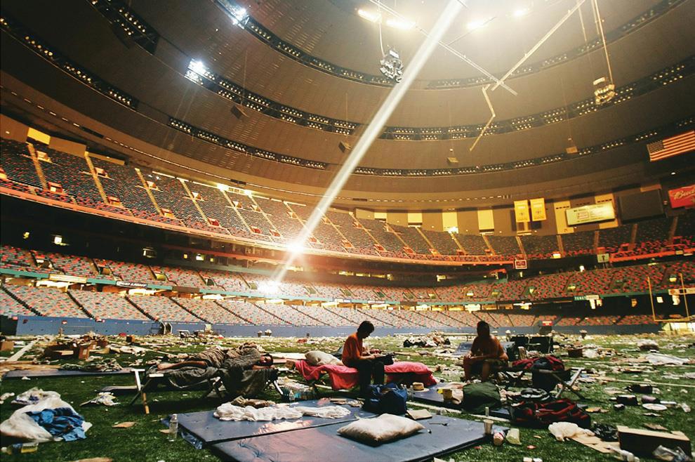 Супердоум" (крытый полусферической формы стадион, который власти  объявили центром помощи, и который превратился в место бедствия, т.к в  нем не было электричества, туалетов, воды, не подвозились припасы и т.д.  Теперь власти говорят что этот "центр помощи" сам надо эвакуировать в  первую очередь - перев.), из которого автобусами эвакуируют 25000 в  Астродоум в Хьюстоне (полагаю, такой же точно крытый стадион - перев.),  превратился в место хаоса.